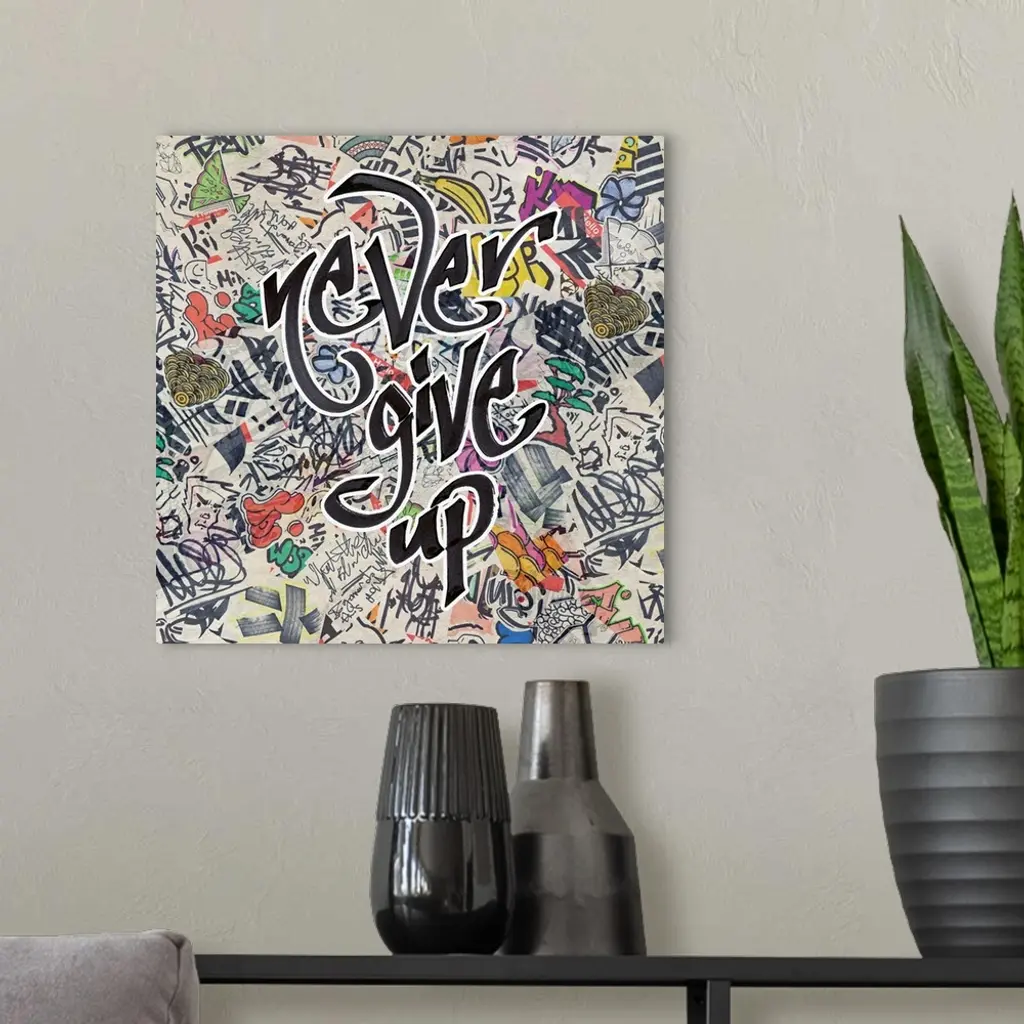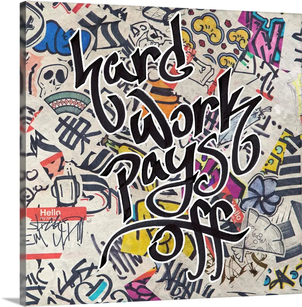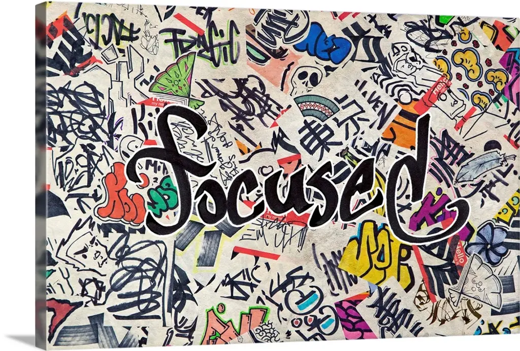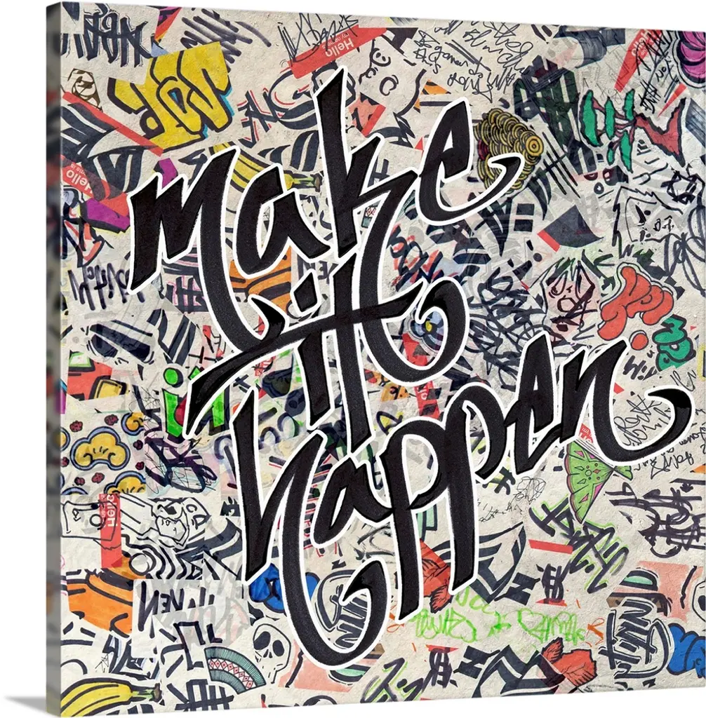 Graffiti-style lettering over a grunge background of pop stickers and symbols.