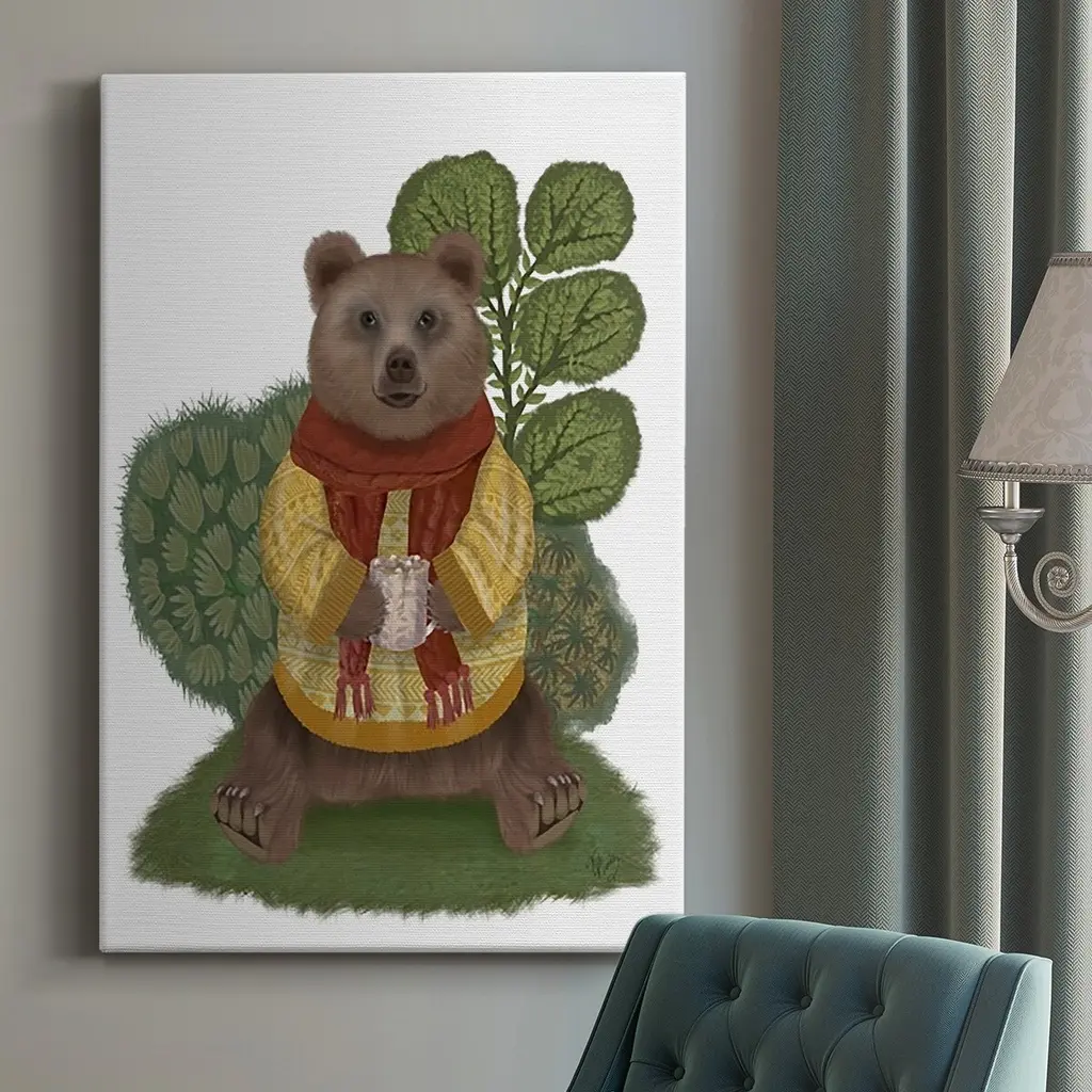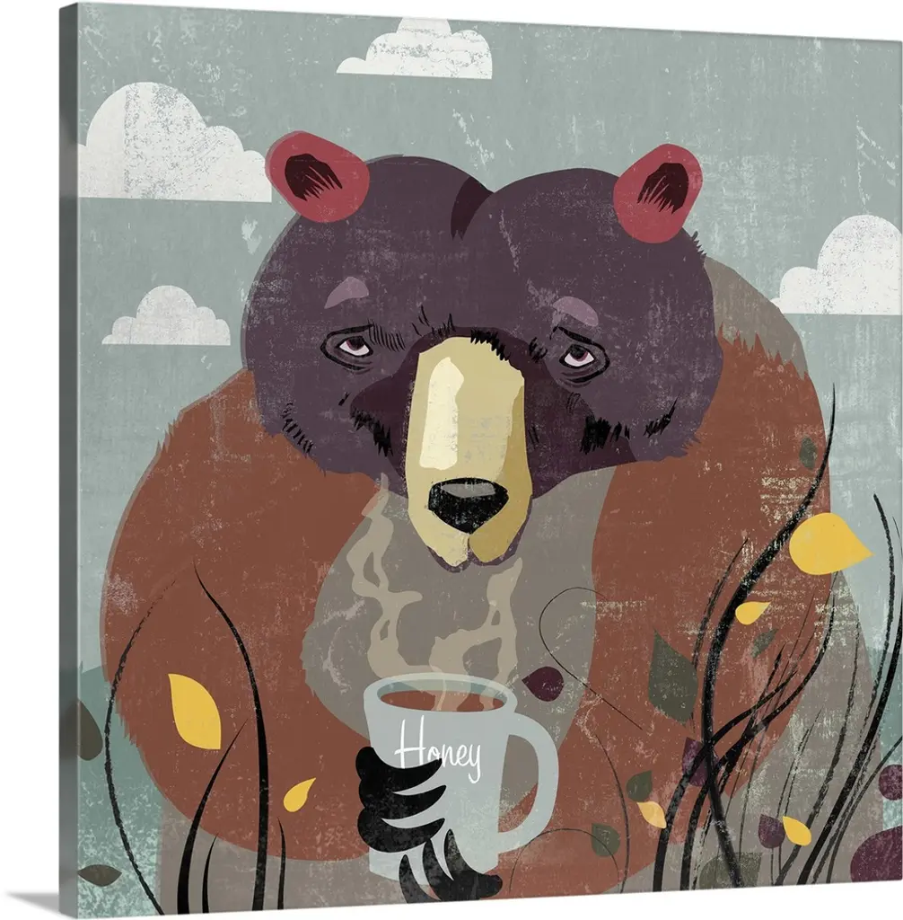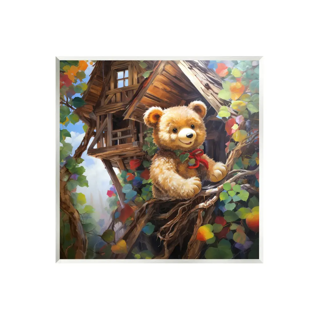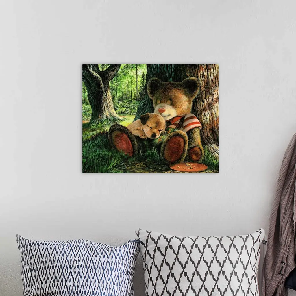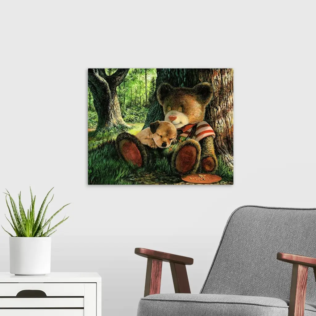 A teddy bear sleeping against a tree in a forest with a puppy laying his lap.