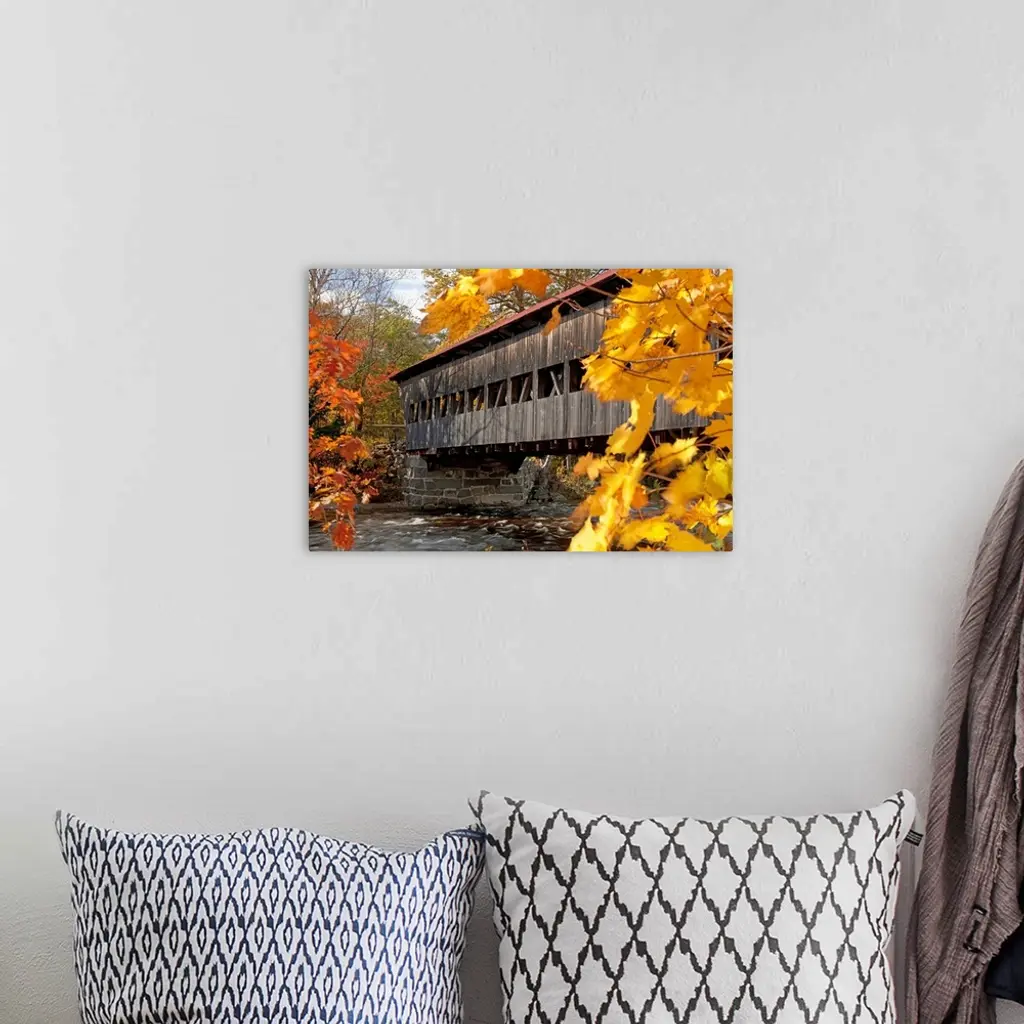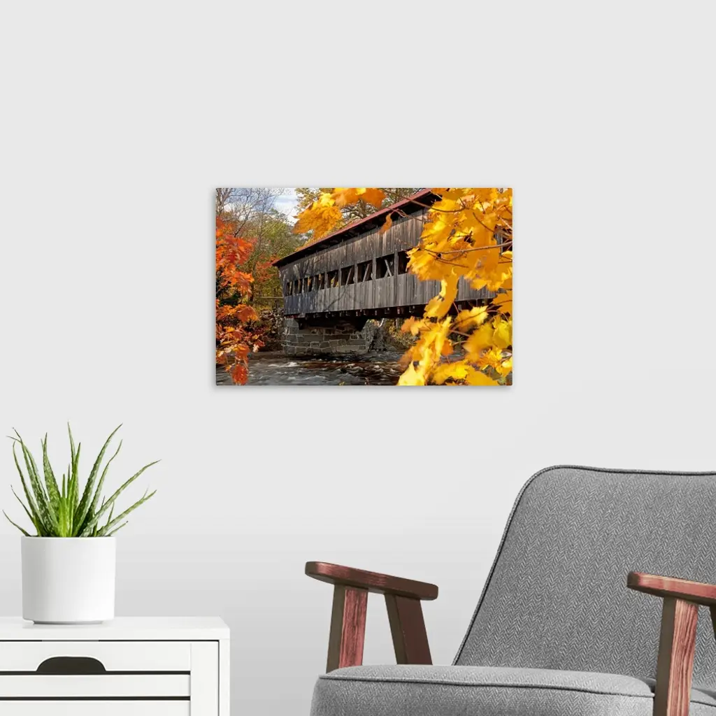 New England, New Hampshire, White Mountains, A Covered Bridge Over A River In Autumn wall art for home and office decor. Discover canvas art prints, photos, mural, big canvas art and framed wall art in GreatBigCanvas.com's varied collections.