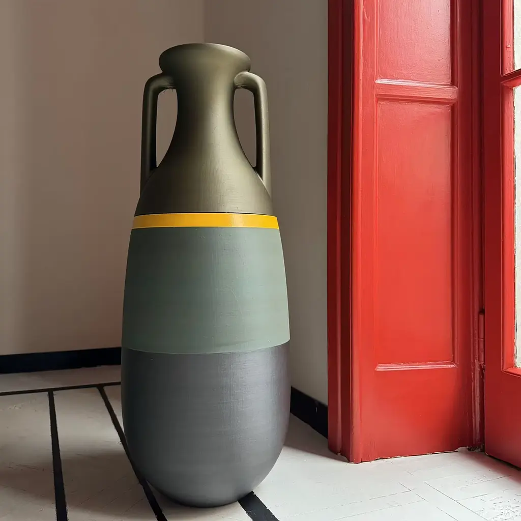 Pop reinterpretation of archetypal design. This vase is inspired by the Roman amphora typology by Heinrich Dressel, based on findings from the Monte Testaccio archaeological site in Rome. Made using 3D printing technology, it transforms PLA filaments into an iconic classical silhouette. Crafted exclusively with high-grade PLA, the vase features an elegant combination of Black, Military, Melon and Kaki colors.