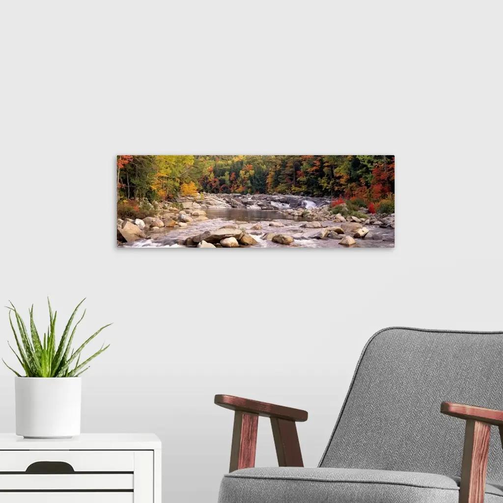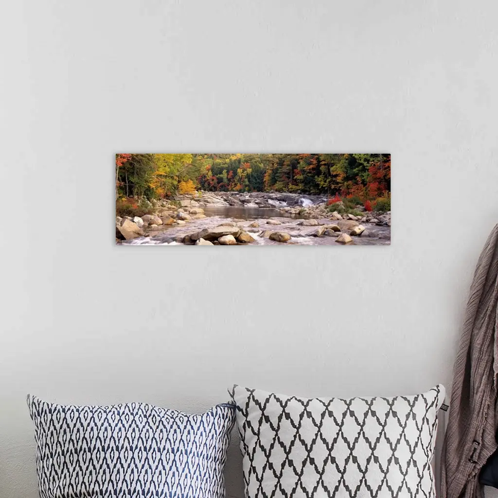 A relaxed panoramic landscape of large boulders in a New England river lined with trees with autumn colors.