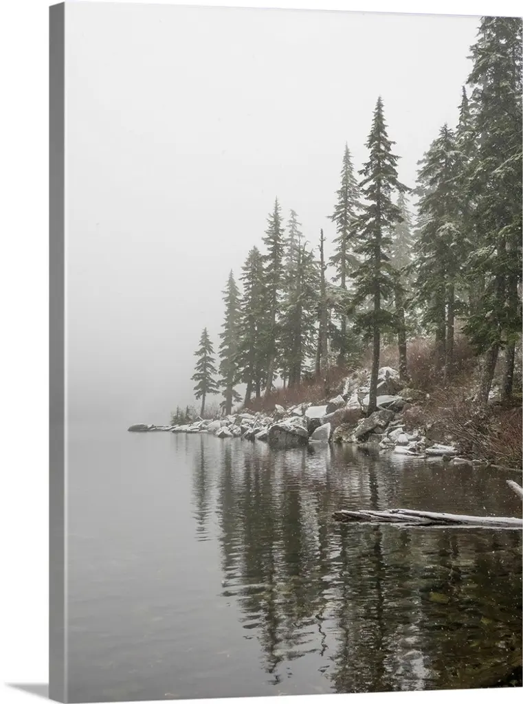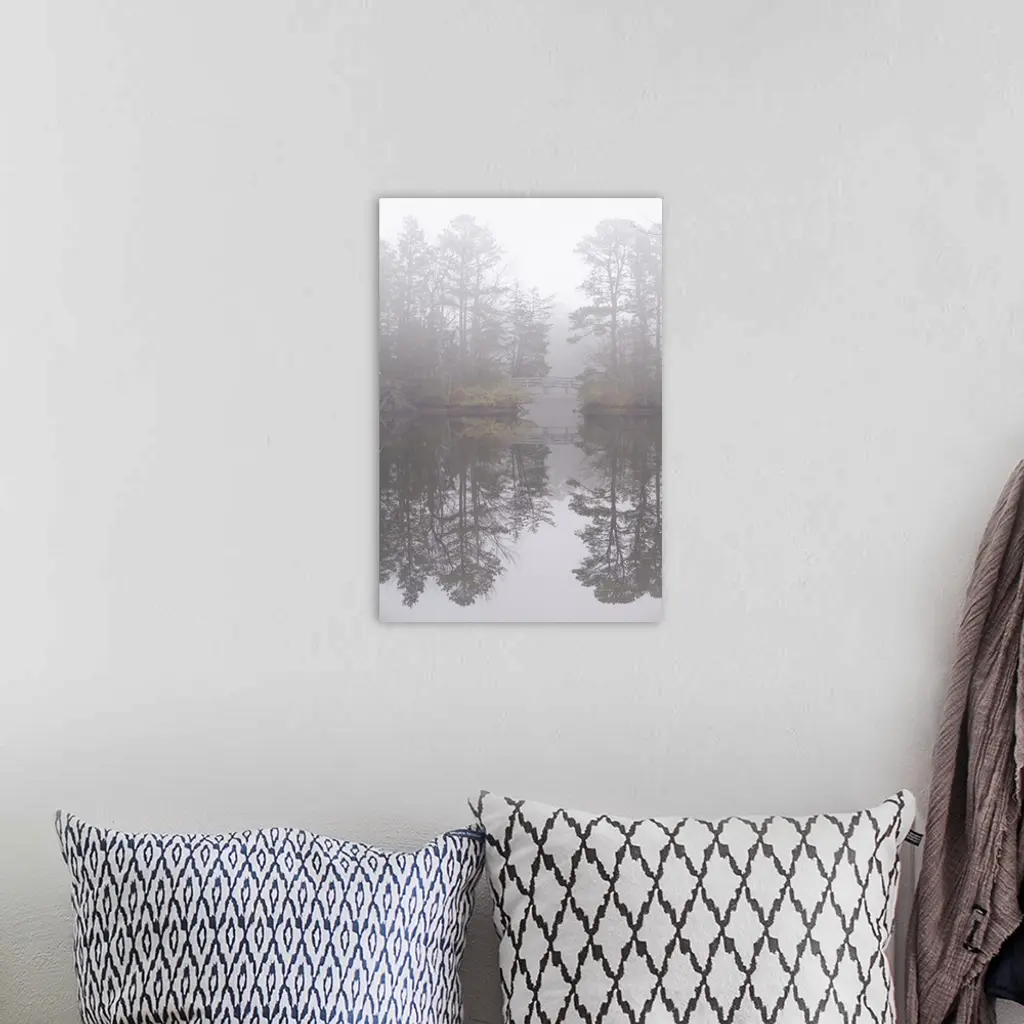 New Jersey, Pine Barrens National Preserve, Foggy Forest And Bridge Reflect In Lake