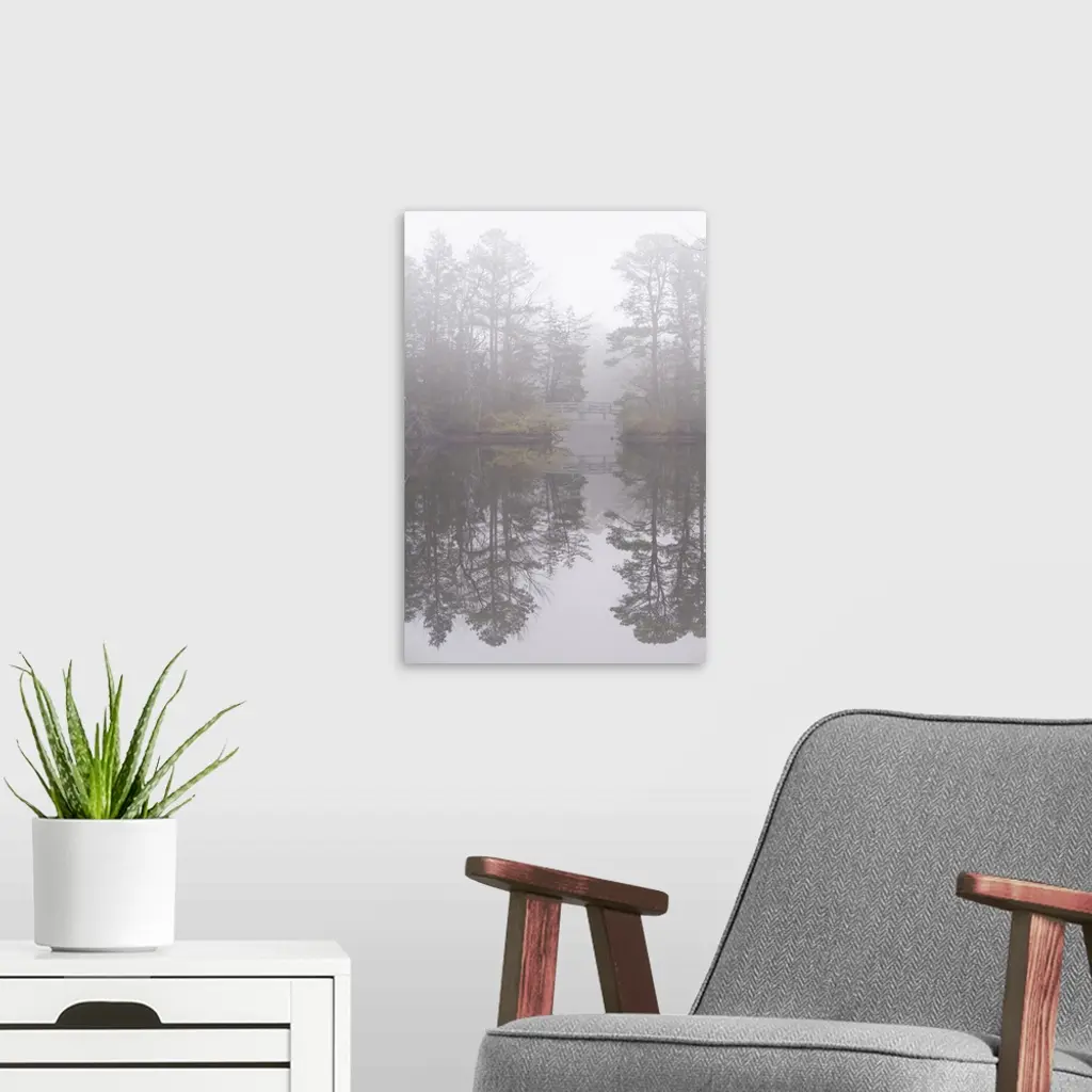 USA, New Jersey, Pine Barrens National Preserve. Foggy forest landscape and bridge reflect in lake. United States, New Jersey.