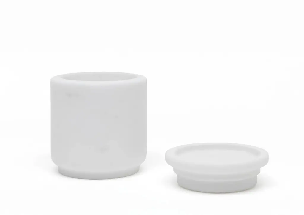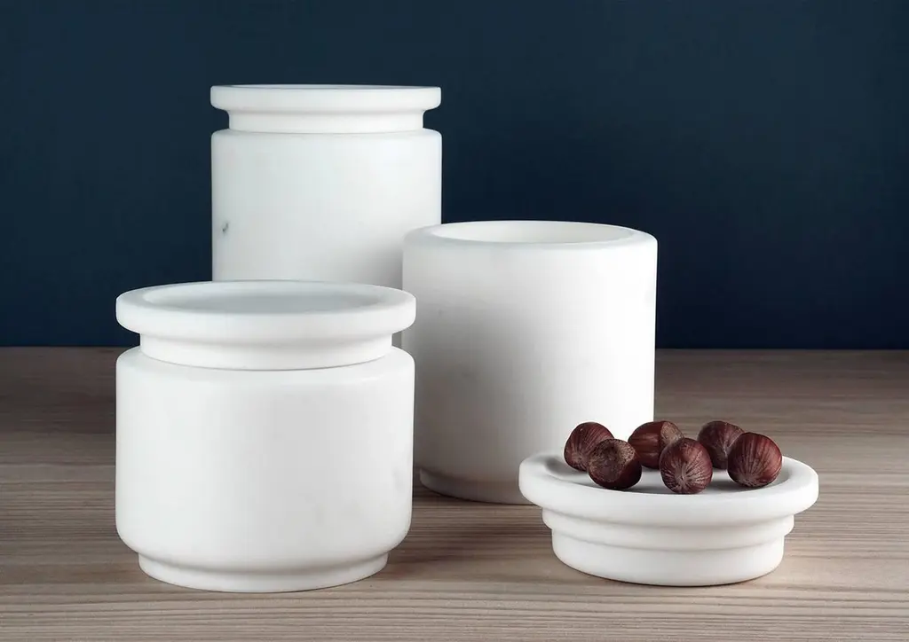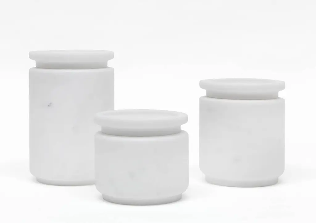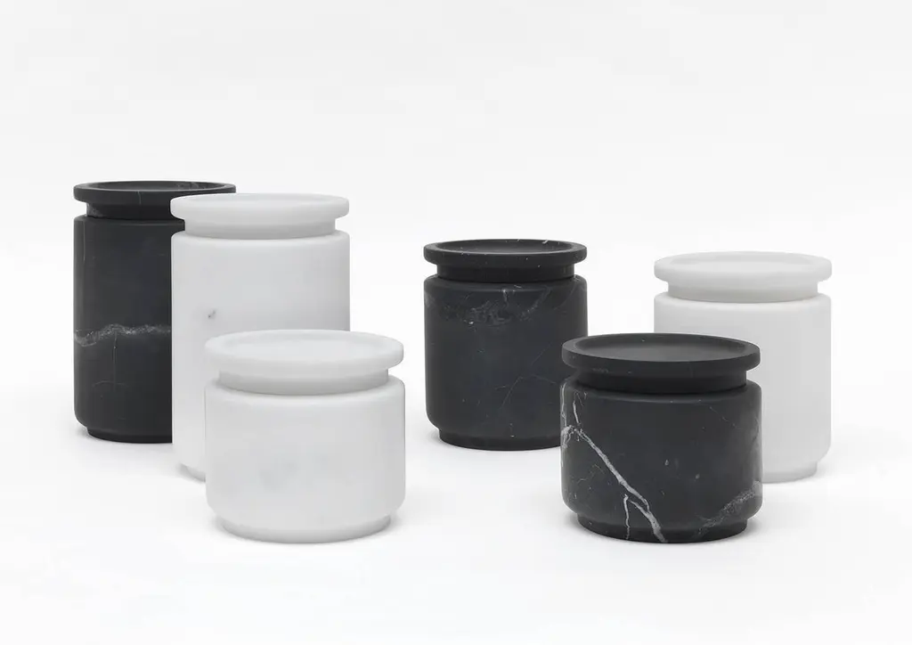 Pyxis pot / jar / container for multiple uses.Size: 12.6 x 14.5 cm, smooth finishing. Commercial name: Pyxis M, Pyxis Collection by the Spanish Designer Ivan Colominas. Available also in Black Marquinia marble and different sizes. Made in Italy, hand finished.Colominas redesigns the object, the article for the table, the container as decoration, elevating it through the perfection of marble. A collection of lightweight, everyday objects that evade the burden of banal production: the choice of the noble Michelangelo and the black Marquinia light up even the simplest and most defined of designs.MMAIRO marble products are made of valuable materials and need to be handled with care. Any difference between similar objects and from their picture on the catalogue are due to the nature of the marble, and costitute an additional value of each piece, making it truly unique and special. The contact with acid or corrosive substances may adversely affect the surface. Hand washing is recommended. Special stain treatment, where necessary food compatible.