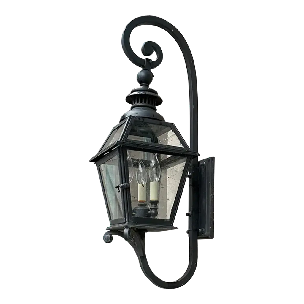 New Orleans brings the fashion of the French Quarter to your front door. A classical lantern descends from elaborate, sweeping swirls and curves. Angled, clear beveled glass complements the gracefulness of the curvatures.