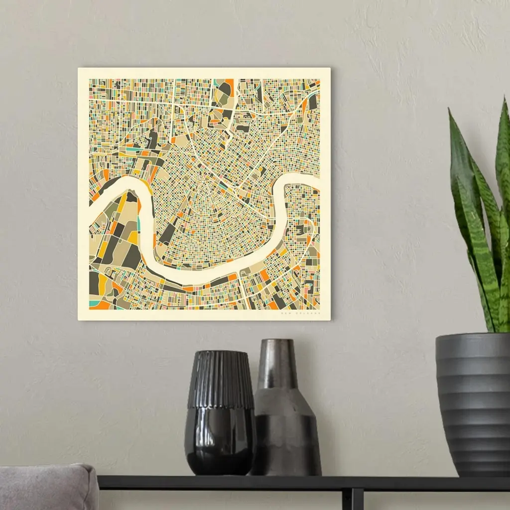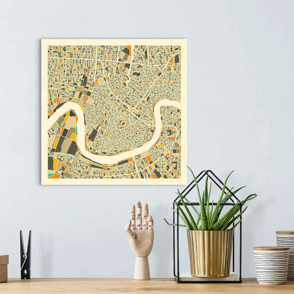 Colorfully illustrated aerial street map of New Orleans, Louisiana on a square background.