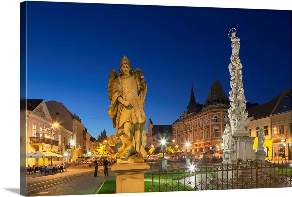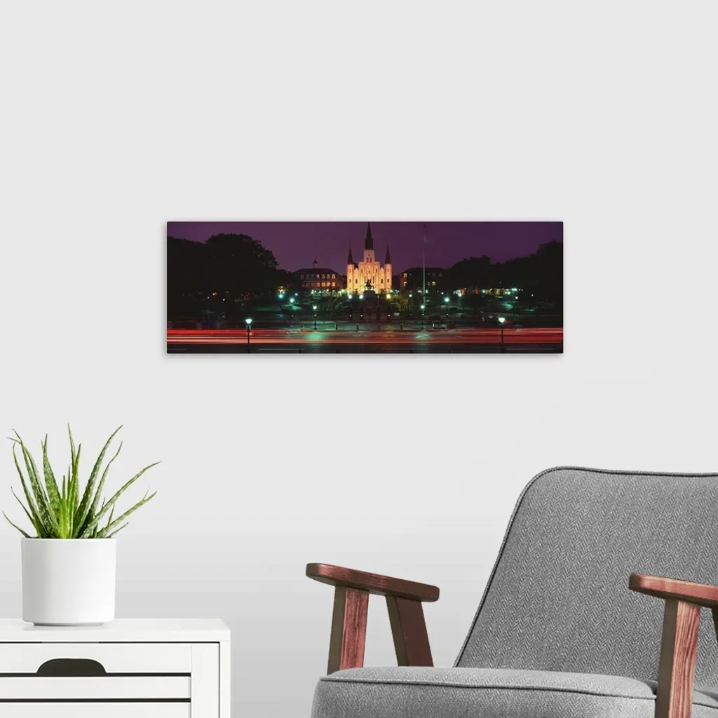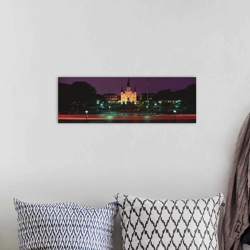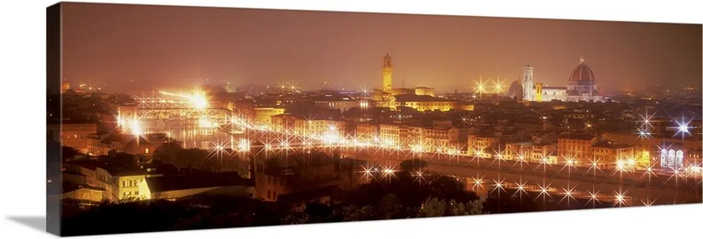 This is a time lapsed photograph of a historic building on a panoramic canvas.