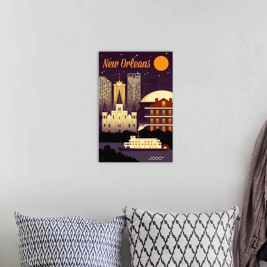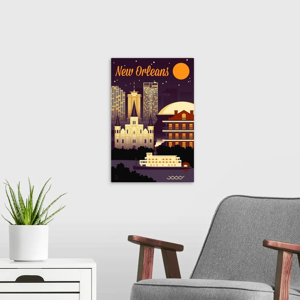 New Orleans, Louisiana - Retro Skyline Chromatic Series wall art for home and office decor. Discover canvas art prints, photos, mural, big canvas art and framed wall art in GreatBigCanvas.com's varied collections.