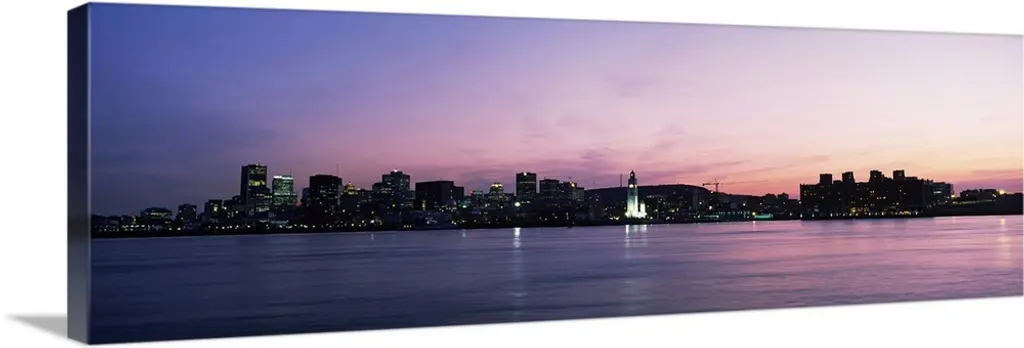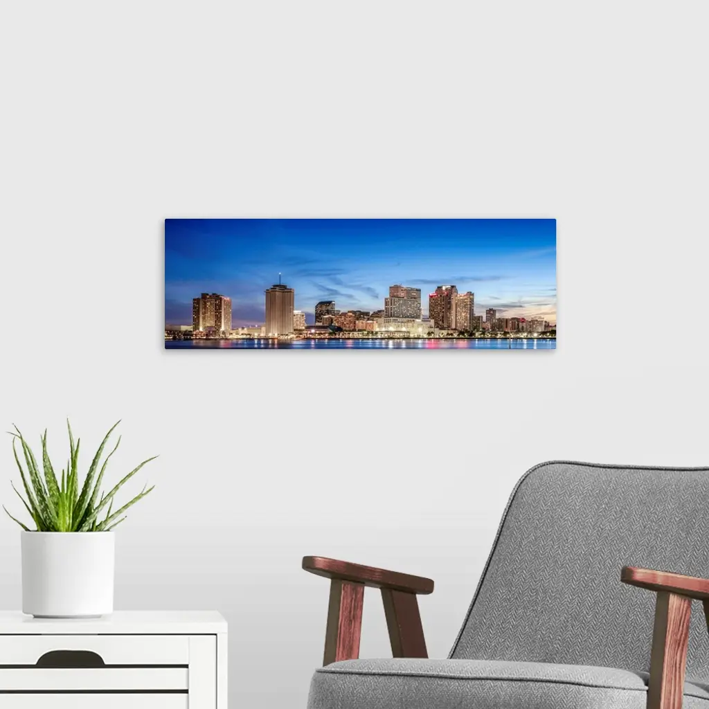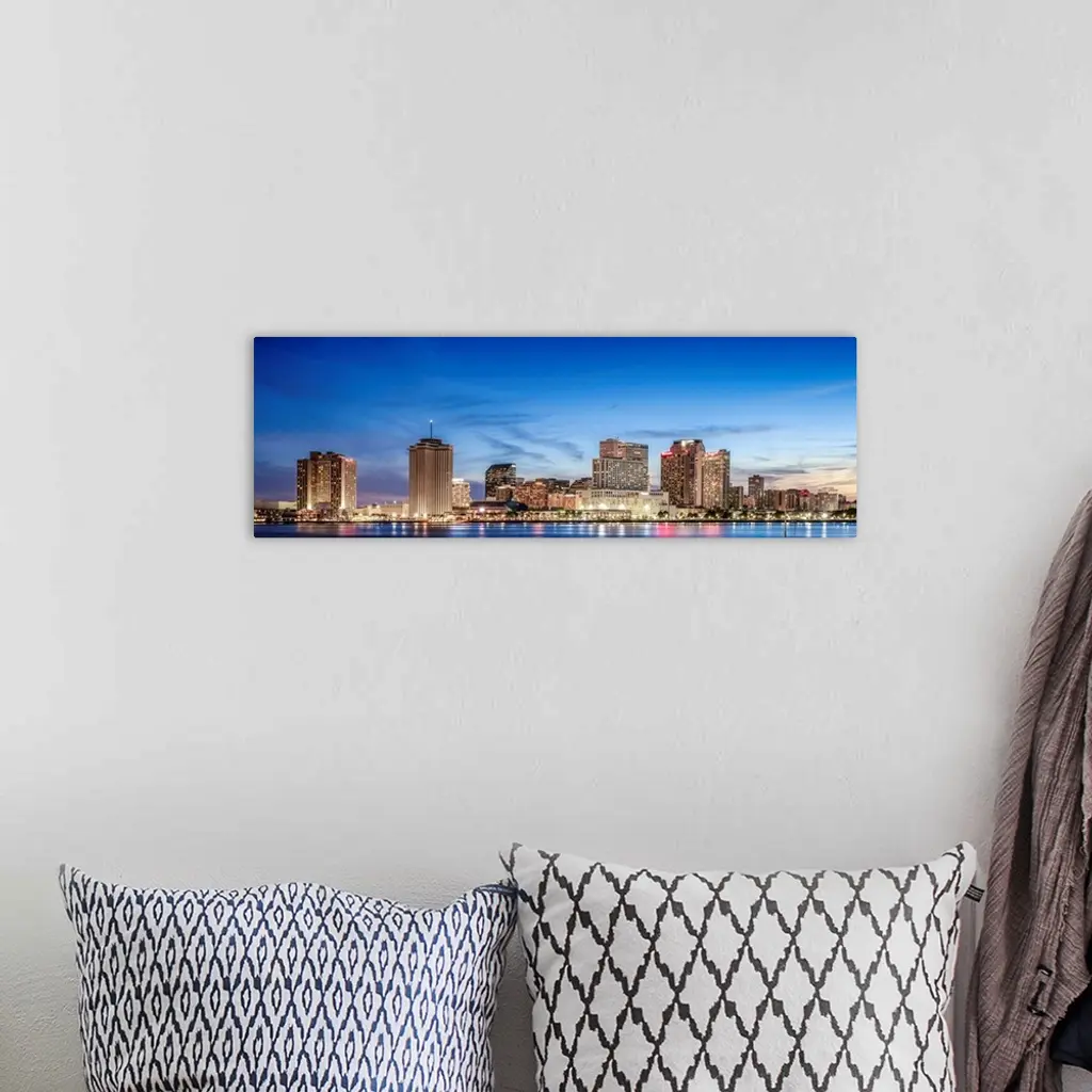 Panoramic photograph of the New Orleans skyline lit up at sunset.