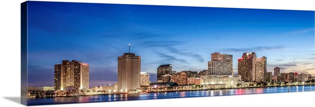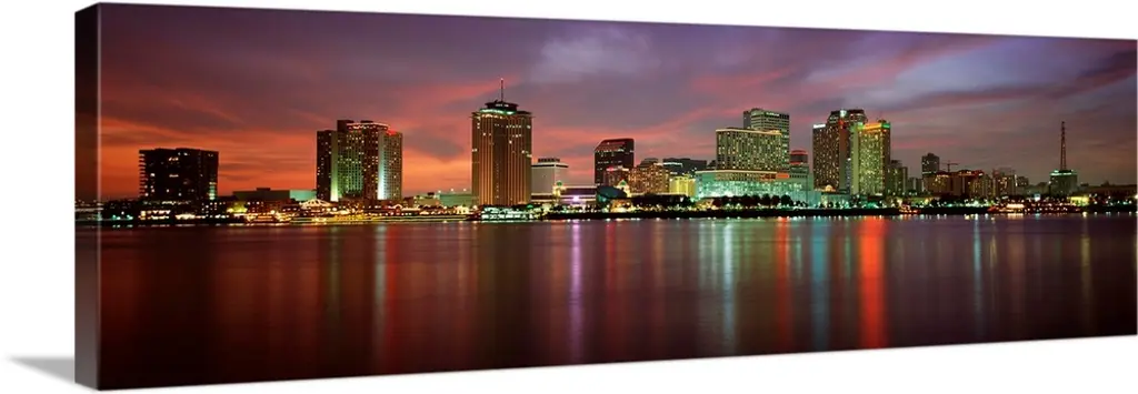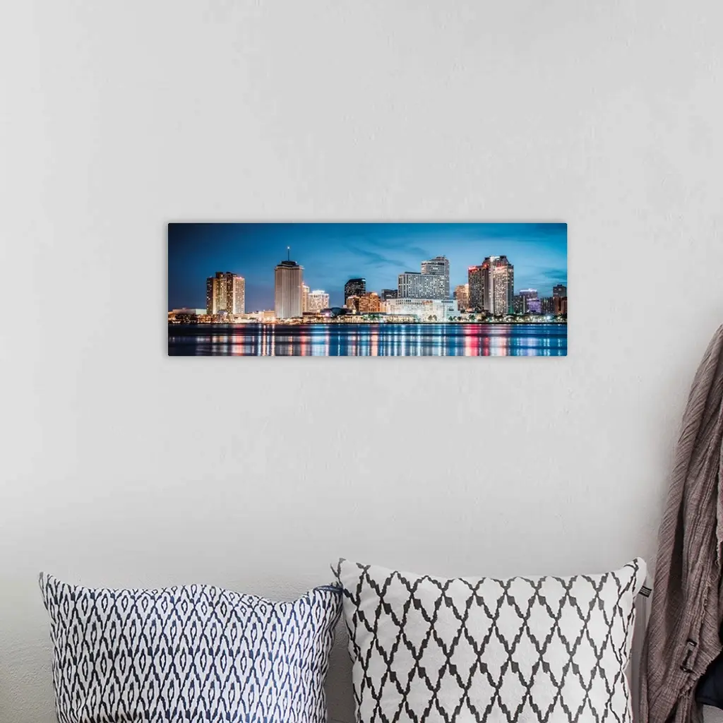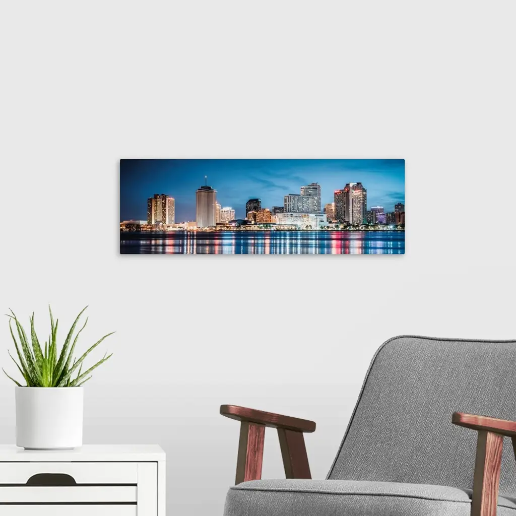 Panoramic photograph of the New Orleans skyline lit up at dusk and reflecting colorful bands onto the Mississippi River.