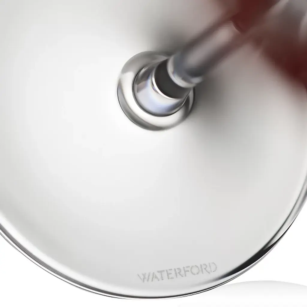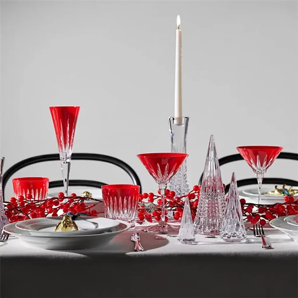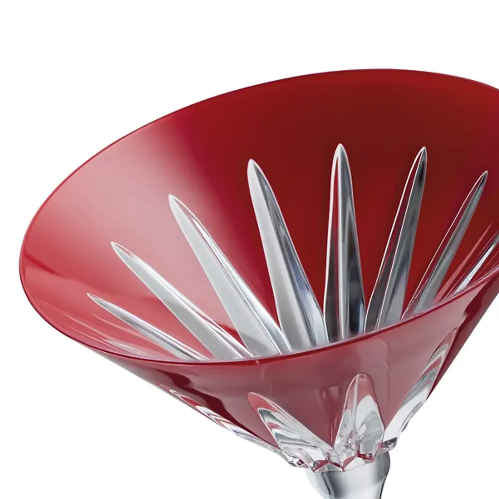 The New Year Firework Martini Set from Waterford captures the energy of celebration through its wide, angular bowl and deep scarlet red crystal. Linear cuts explode outward from the base in a starburst pattern, their sharp geometry intensified by the rich red hue that defines each glass. This design draws inspiration from Waterford's tradition of transforming cut crystal into moments of spectacle, where light becomes refracted and form becomes an occasion.