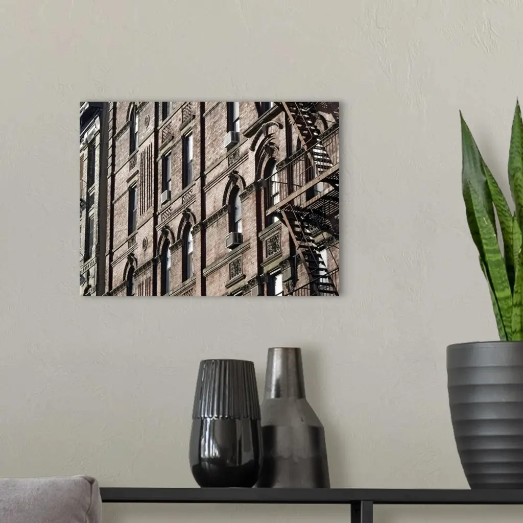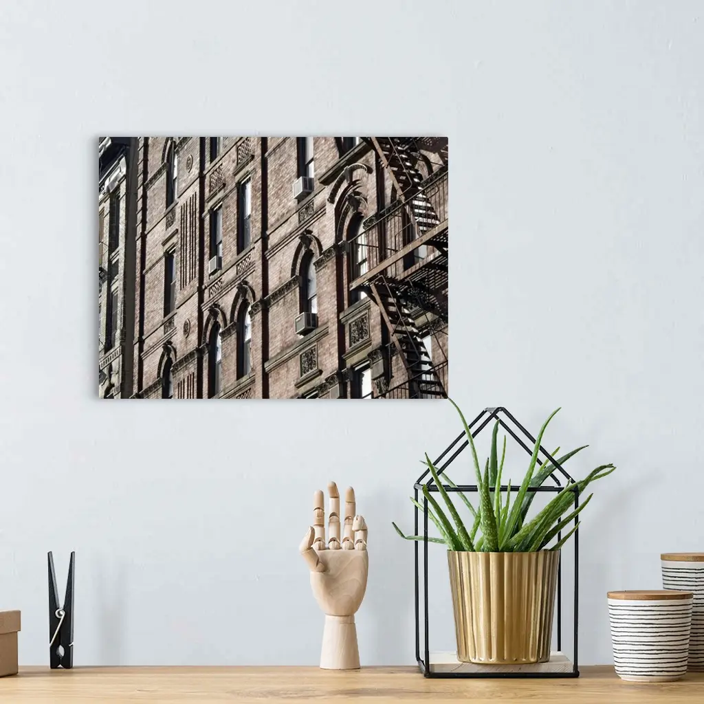 This is a horizontal photograph of the faoade of a brick buildingos window, window mounted AC units, and an iron wrought fire escape.