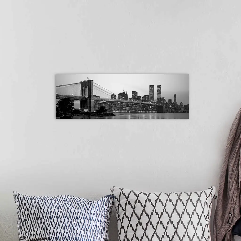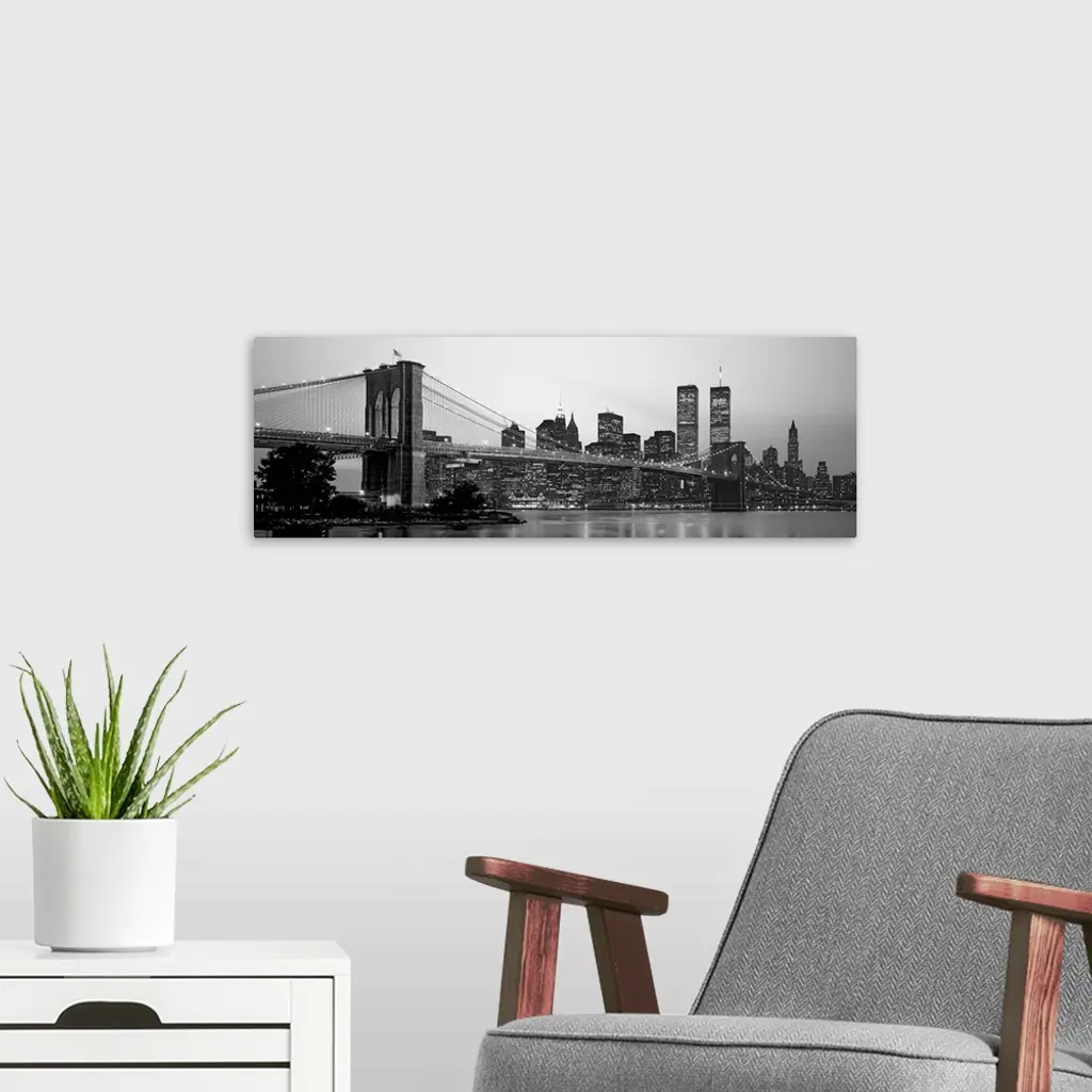 Panoramic photograph of the Brooklyn Bridge against a skyline filled with skyscrapers in New York. The buildings and bridge can be seen reflecting in the water below.