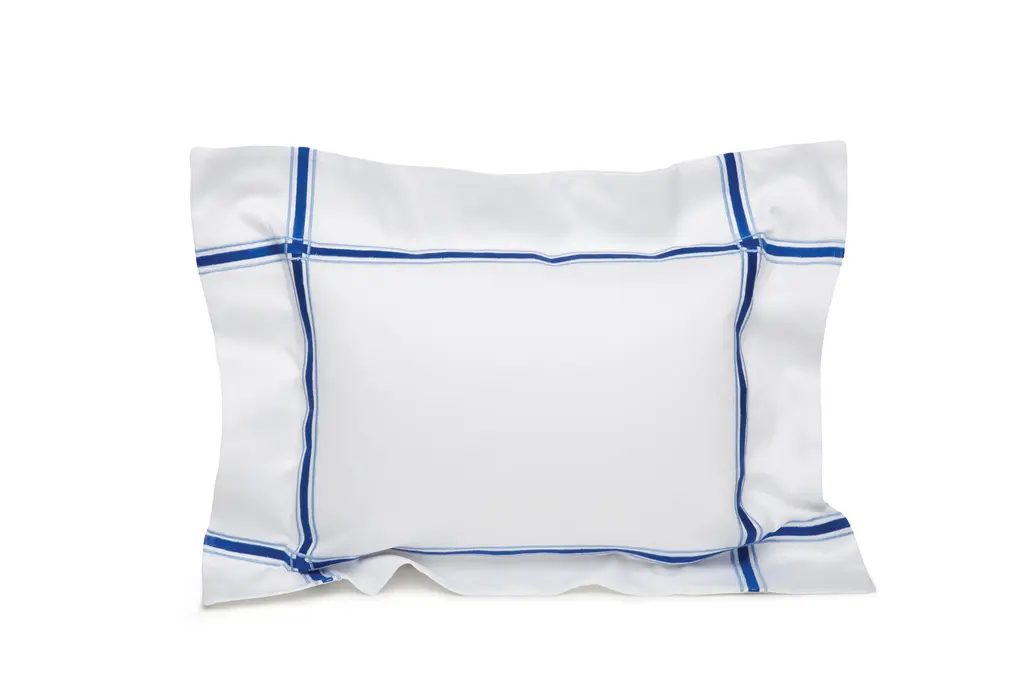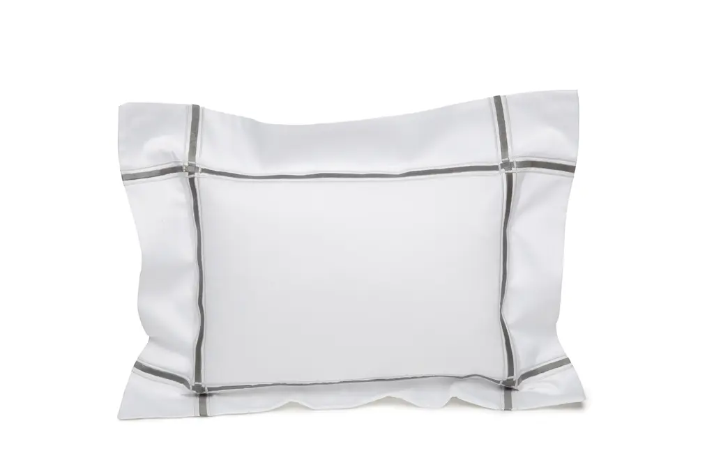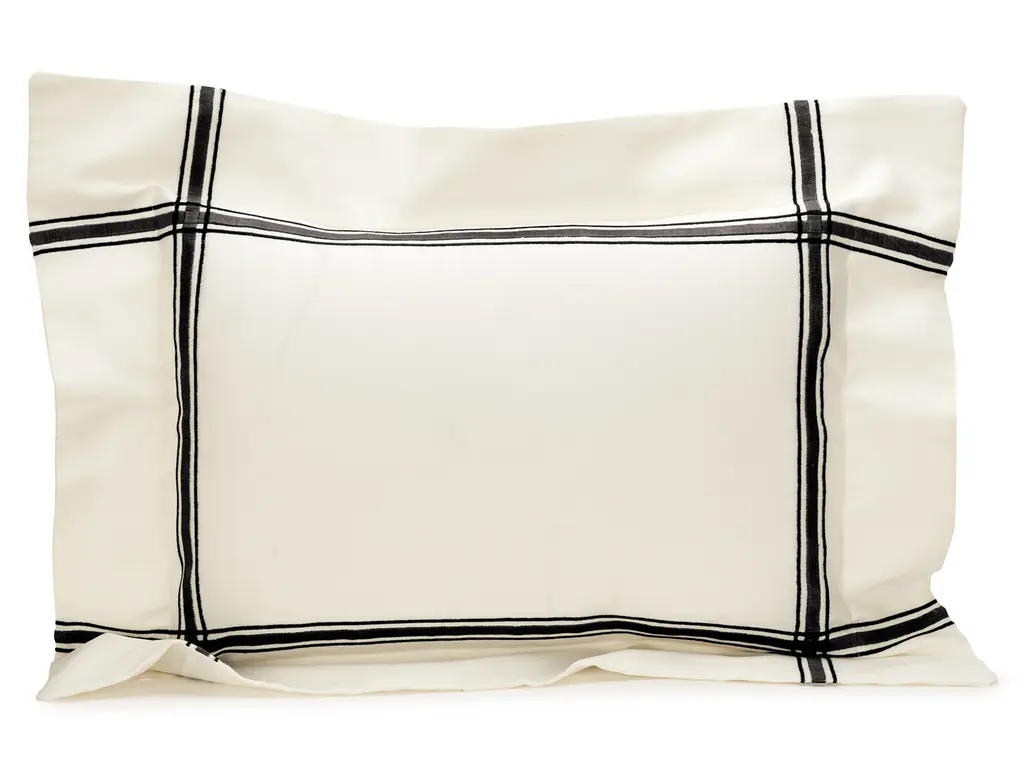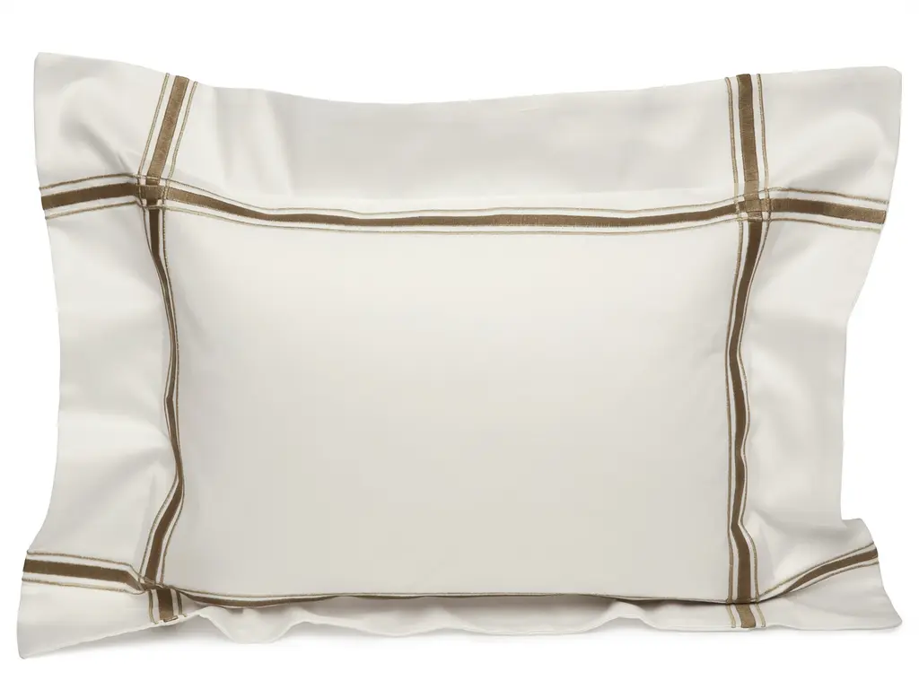 Displaying a great sense of style with a cosmopolitan air, luminous pure White Egyptian cotton sateen, 600 thread count, is an impressive setting for rich embroidery in two shades of Mocha, Gray or Navy on White, Charcoal Grey/Black on Ivory or Mocha on Ivory. Crafted with all the aesthetics of the finest Italian tailoring, it has definite connoisseur appeal.