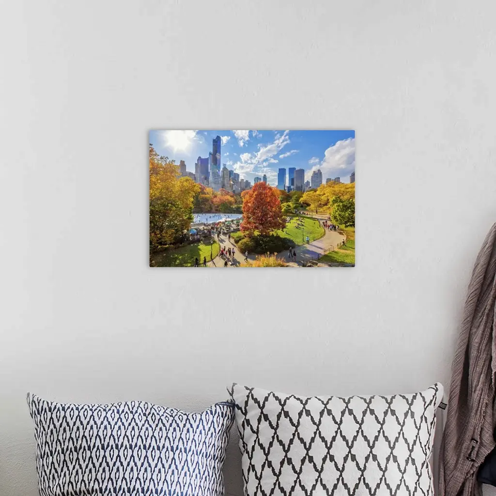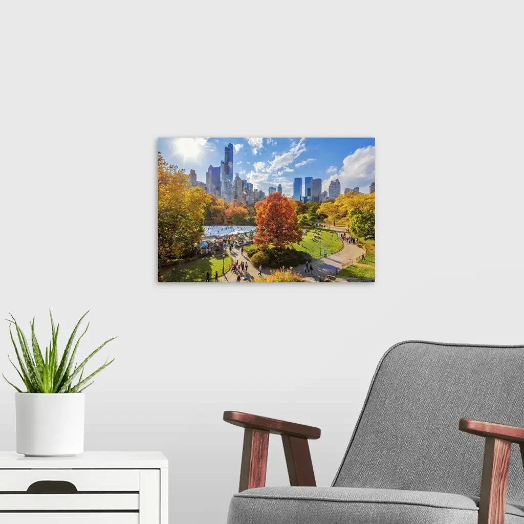 USA, New York City, Manhattan, Central Park, Central Park South, Columbus Circle and Time Warner Center skyline in the background.