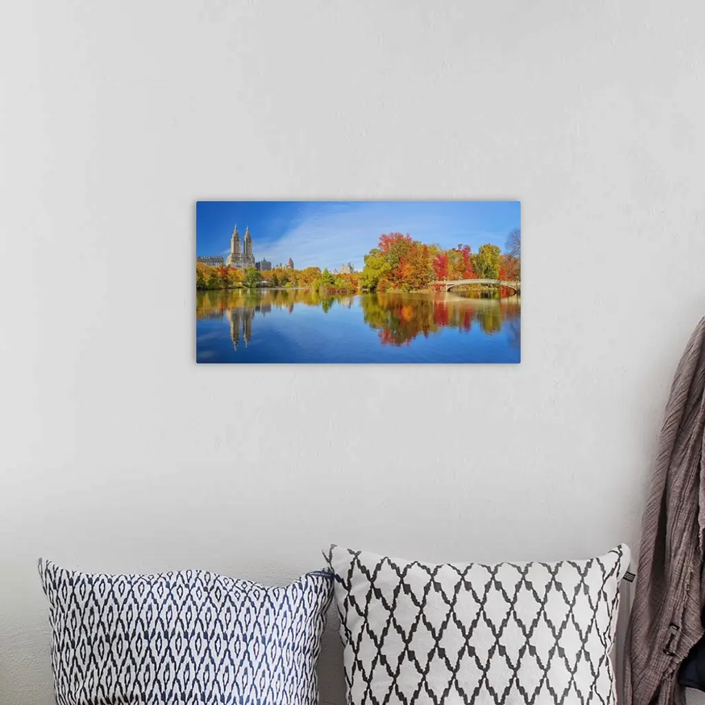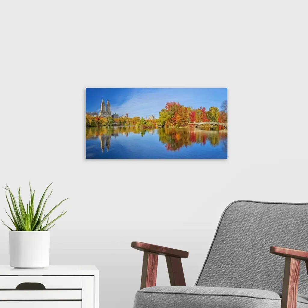 USA, New York City, Manhattan, Central Park, San Remo Apartment towers and the Bow Bridge.