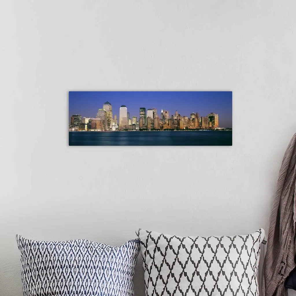 Panoramic photograph taken of smaller skyscrapers that sit on the edge of water in New York City.