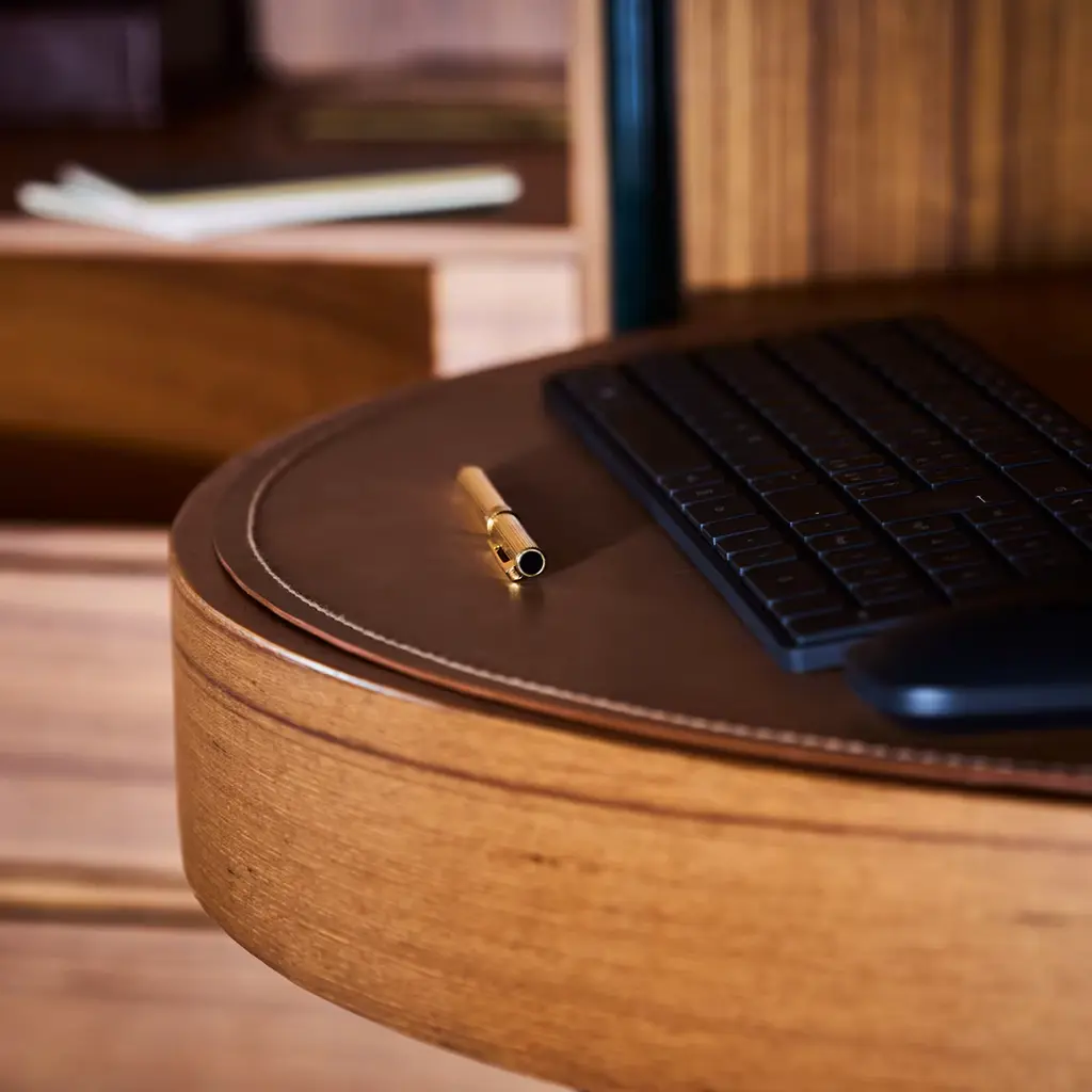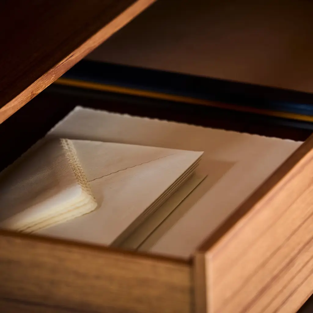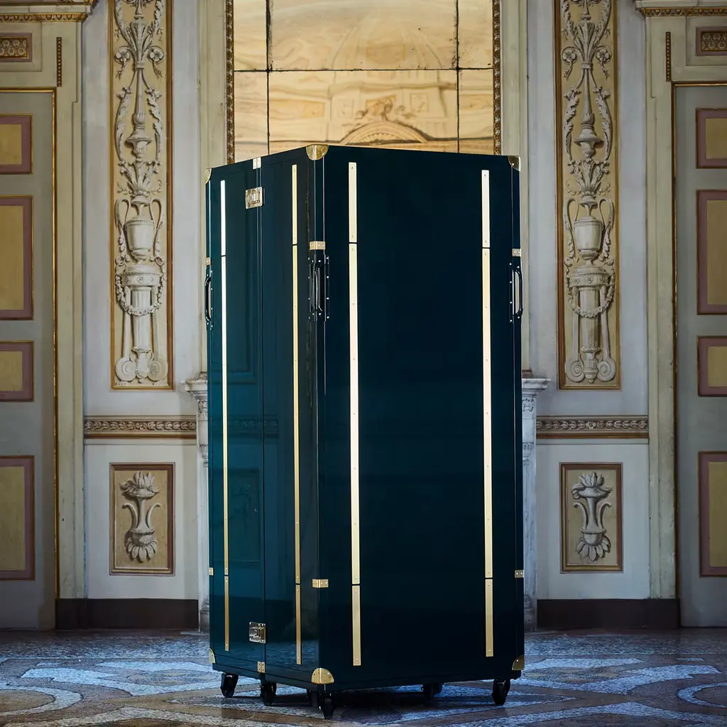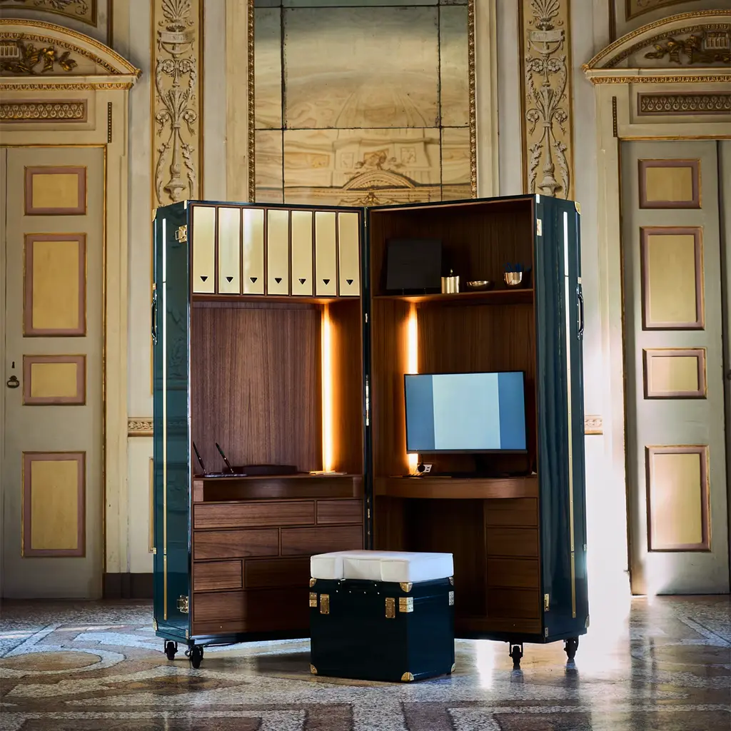 Ideal for a hotel suite, New York is a true, luxury mobile office, complete with all you need for a functional workstation. Externally polished lacquer “piano” effect with inserts in matte brass, lacquered trim, and handles in tone-on-tone effect, locks, and edge protectors in polished brass. Internally upholstered in teak wood with details, such as folder holder, in matte brass. It includes LED backlighting on both sides and a pouf in polished lacquer finish with details in brass.