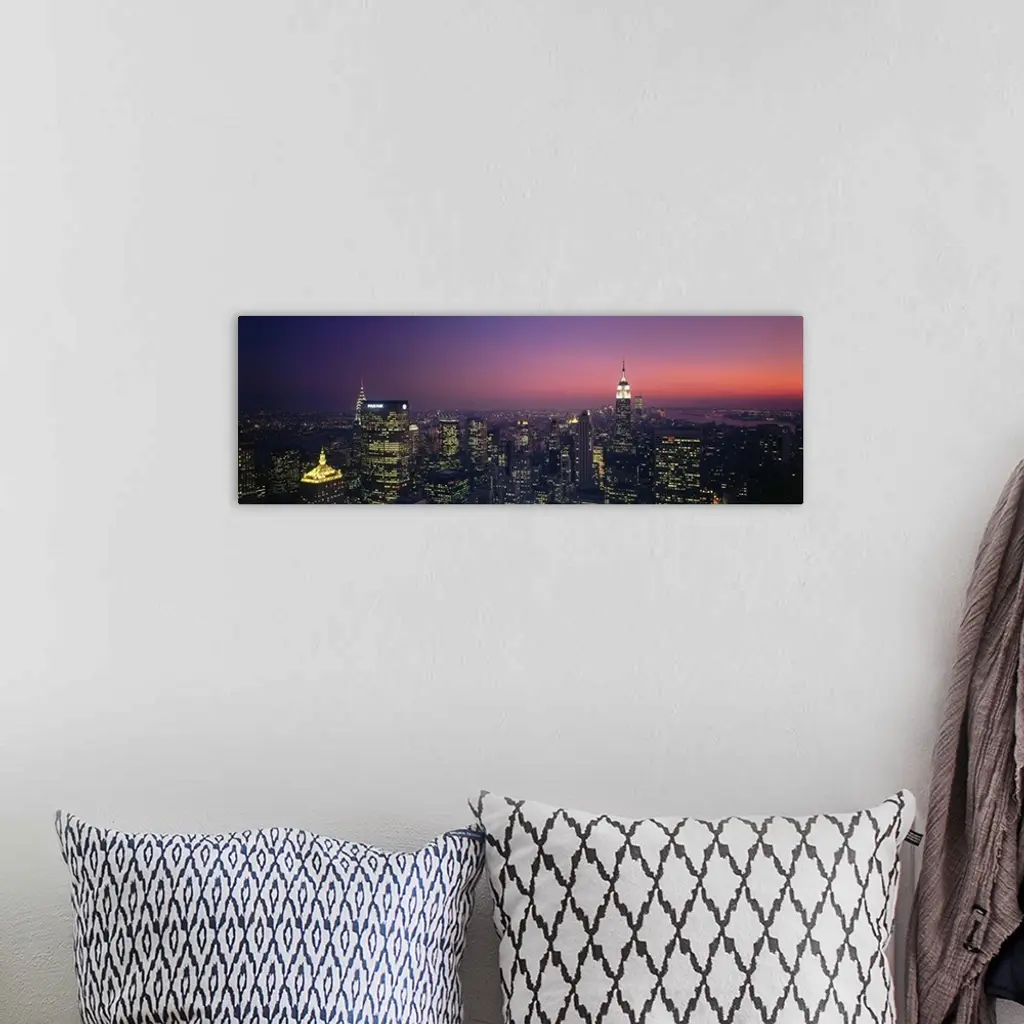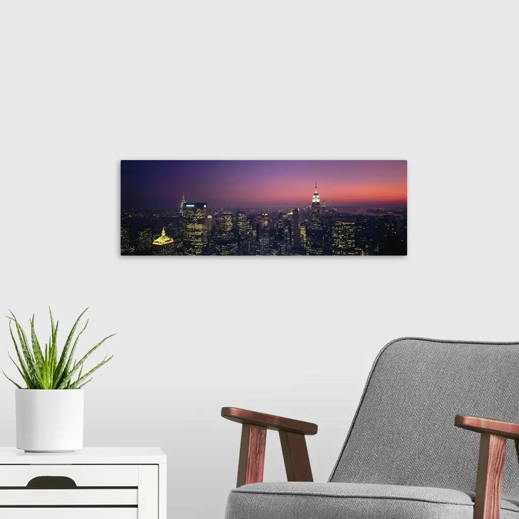 Aerial view of New York City at late dusk with lit up office buildings, the Chrysler Building, and Empire State Building in distance.