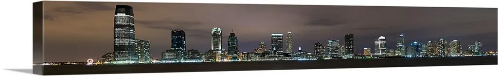 Panoramic vista of the New York City skyline in the evening, with beams of light from the World Trade Center tribute shining in the sky, in black and white.