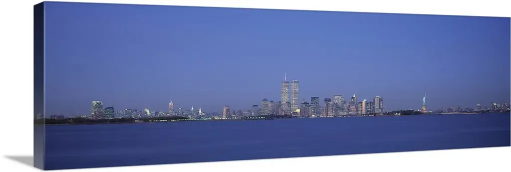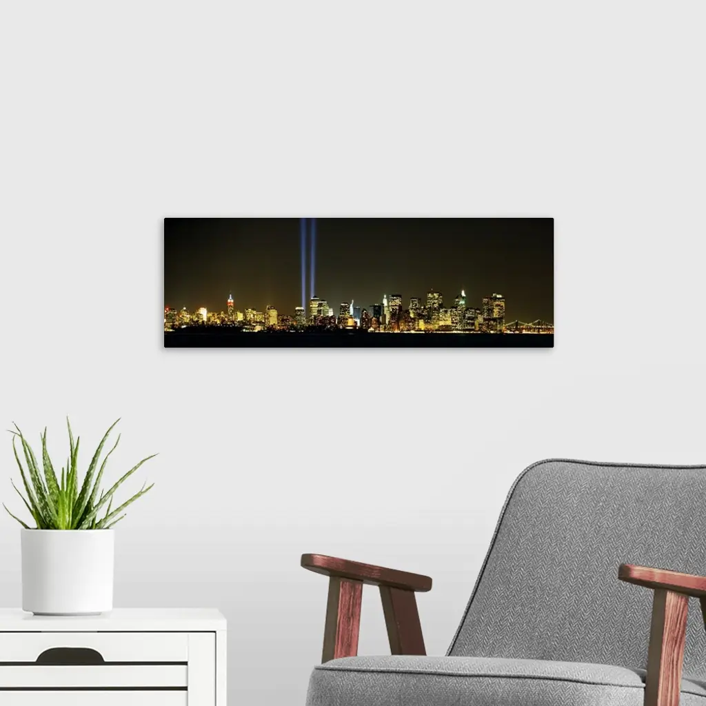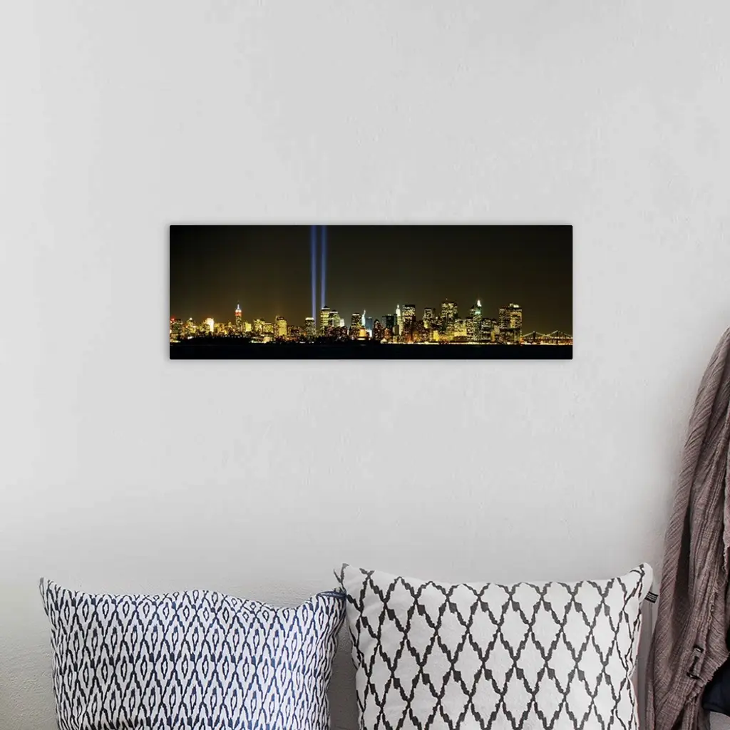 Panoramic photograph displays the Tribute in Light shining brightly in the middle of various skyscrapers within the New York skyline at night.