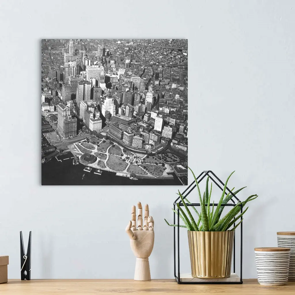 An aerial view of lower Manhattan showing the Woolworth Building and the Aquarium, c1920: from a stereograph view.