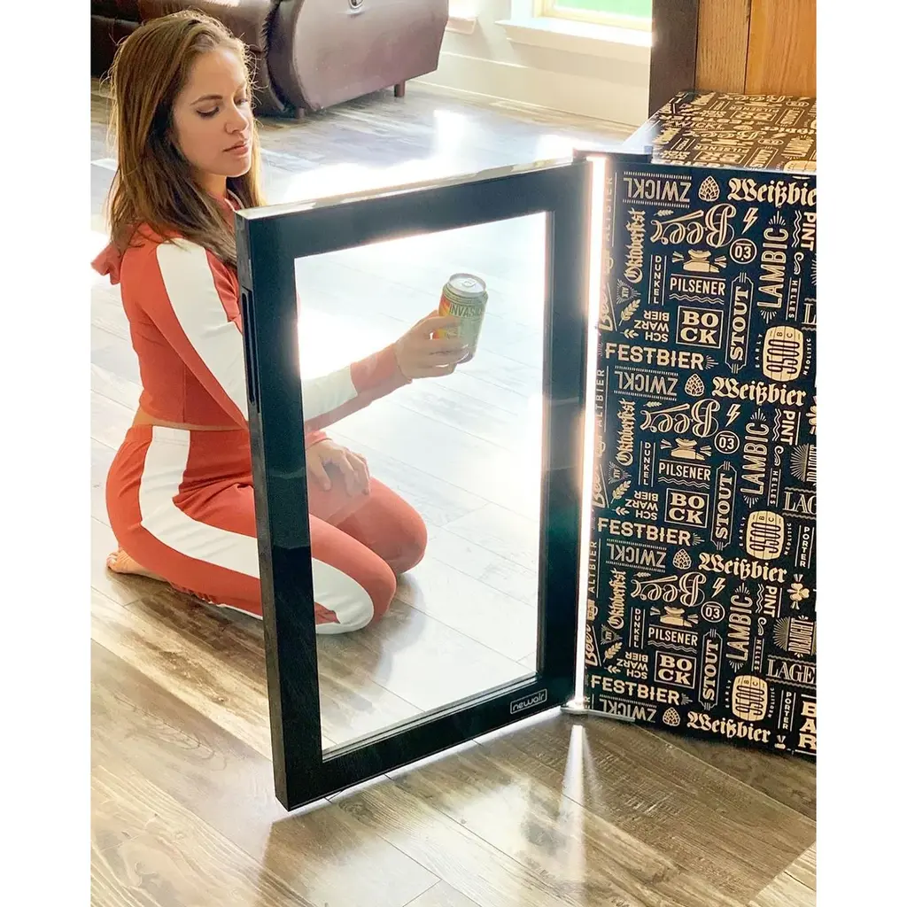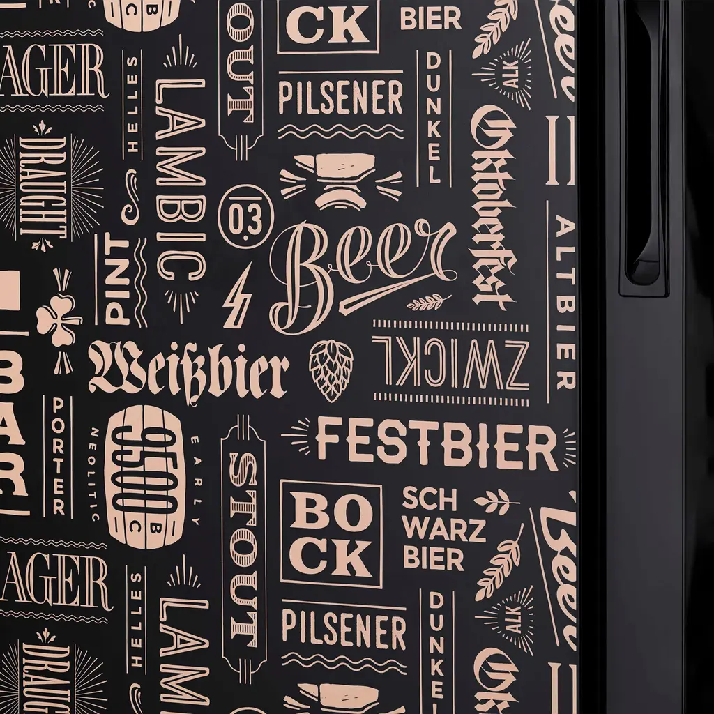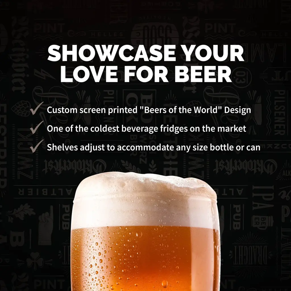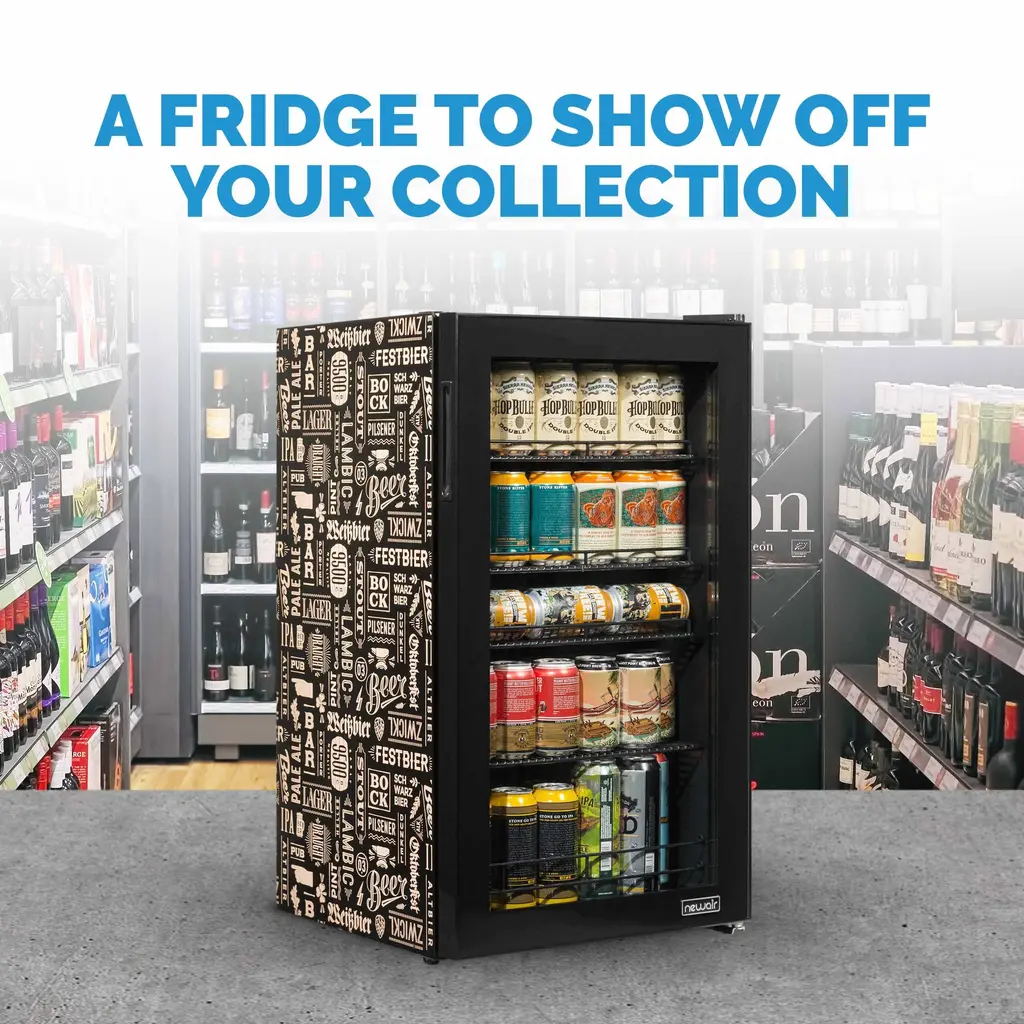 Overview Show off your home bar or man cave with the custom designed “Beers of the World” 126-Can Beverage Fridge. The exterior is screen printed in durable graphic lettering to proudly show off your favorite beer varieties from all over the world. Inside, you get the same icy chill and organizational features that you've come to expect from Newair products. Benefits 1. Form and Function in One Perfect Beverage Cooler This custom beverage fridge features on-trend design that highlights your love of craft brews. The sharp black exterior has an all-over print filled with graphics reminiscent of hand-printed beer signs and vintage bar art. Designed to stand out, this beverage fridge is the perfect accessory for any beer lover. 2. Customize Temperatures for Total Refreshment The easy-to-use thermostat lets you dial the “Beers of the World” fridge all the way down to 37 degrees for the coldest drinks available anywhere. Seven custom settings let you select the ideal temperature for everything from Pilsners to Imperial Stouts, so you'll always have perfect refreshment at your fingertips. 3. Maximize Space with SplitShelf™ Design The “Beers of the World” fridge features sleek, black SplitShelf™ design that lets you double the number of cans you store. The half-depth shelves allow you to stack cans with different footprints on top of each other. If you prefer bottles, place them in front of a half shelf so they can stand upright. With SplitShelf™, you've got options. 4. Store up to 126 Cans in a Small Space The “Beers of the World” fridge has room for up to 126 standard cans in its spacious interior. That's 21 six packs, so you'll never be left high and dry in the middle of a party or potluck. At just 18.5 inches wide and under 33 inches high, it holds a surprising amount of refreshment without taking up a lot of space. 5. Durable Design That's Built to Last The “Beers of the World” fridge isn't just a looker — it's also made to stand up to years of use. The tough door is finished with insulating double-paned glass. LED interior lights highlight your favorite brews, while the freestanding design makes this beverage cooler the perfect addition to any entertaining space.