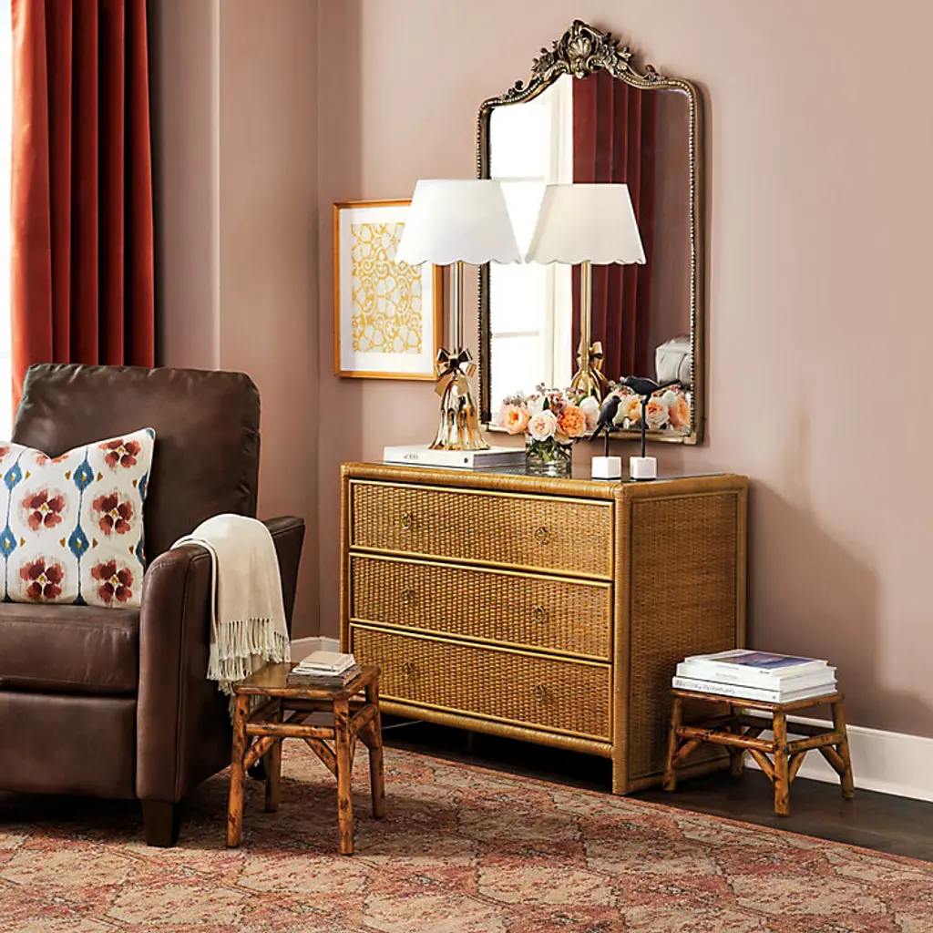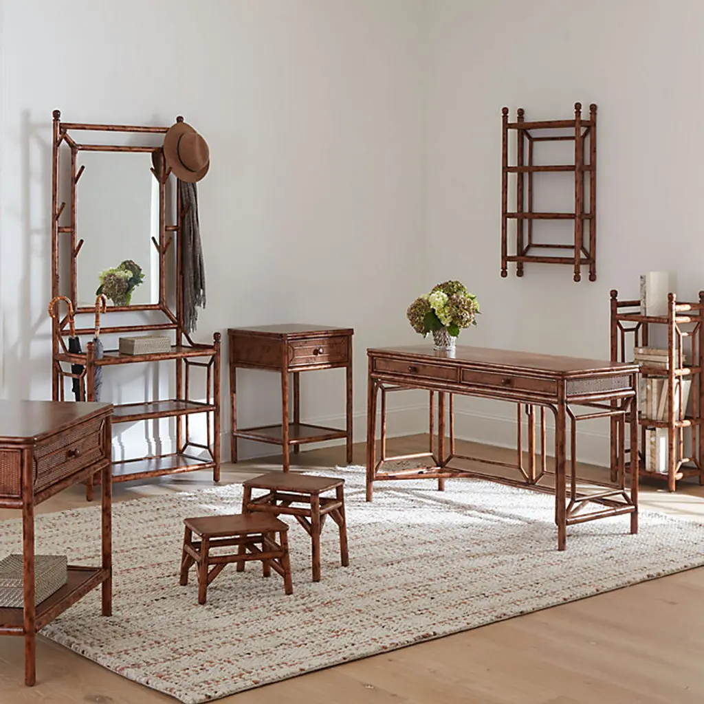 Our Newberry furniture collection recalls the romantic British colonial style popular throughout the world from the 16th to 18th centuries. The genteel look was relaxed and well-traveled with furniture silhouettes rendered in stained rattan, tropical timbers, and bamboo. The Newberry Stand is handmade of sturdy natural rattan and hand finished to capture the rich tortoise shell patina that once defined colonial furniture from exotic, faraway places like Africa, India, and the West Indies. Newberry Stand features: