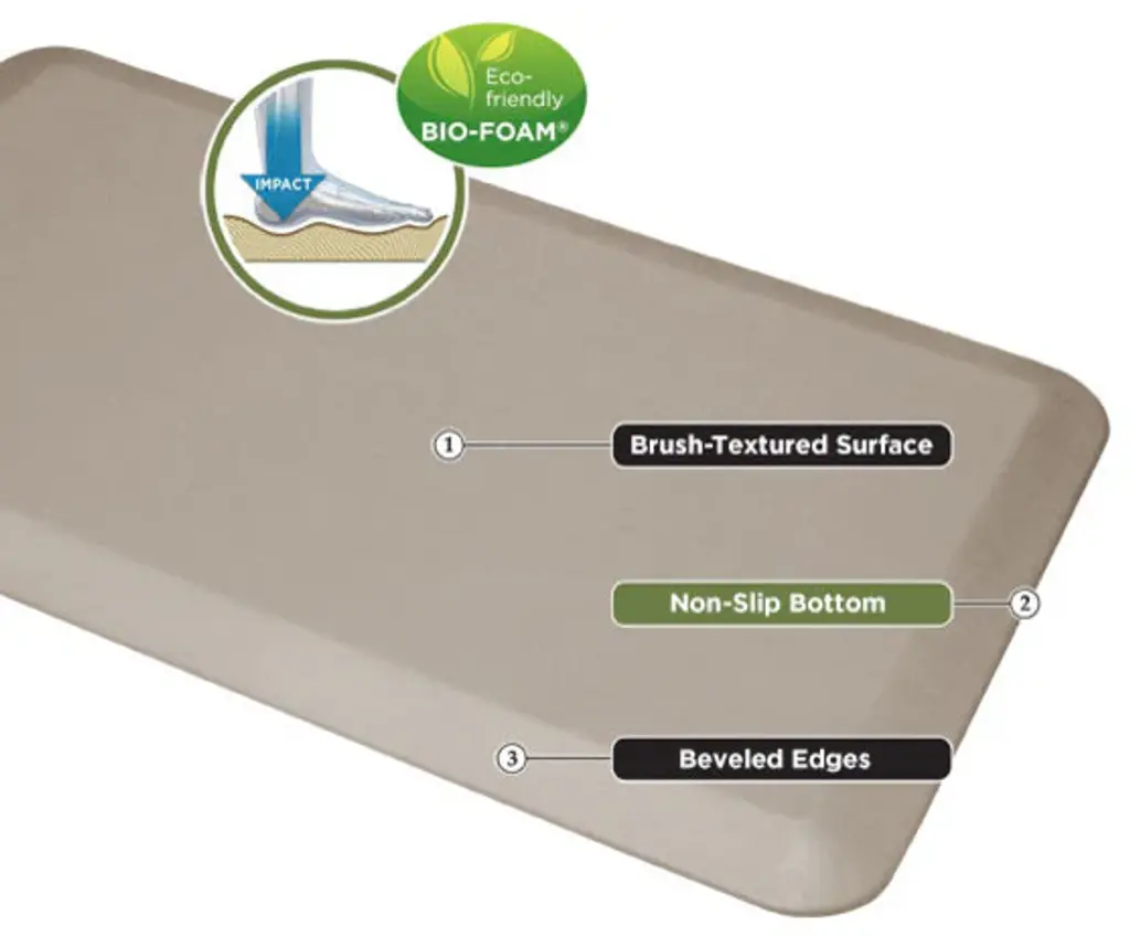 NewLife? Bio-Foam? Mats are ergonomically engineered from plant-based resources and are designed to encourage proper circulation in your feet and legs. Each mat is manufactured with Cellulon? renewable Bio-Foam?. The result is an anti-fatigue mat that supports not only your feet, legs and back, but the environment as well. NewLife Mats'' one-piece construction includes a durable top-surface, a resilient inner core, a tapered edge, and a non-skid bottom certified as "high traction" by the National Floor Safety Institute. Midnight is a deep, dark, eye-catching black with a brushed top-surface. A versatile color that helps pull any room together, Midnight is the perfect complement to virtually any other color. If your objective is to make the room look vibrant and enduring, then NewLife Midnight is the mat-color combination for your decor.