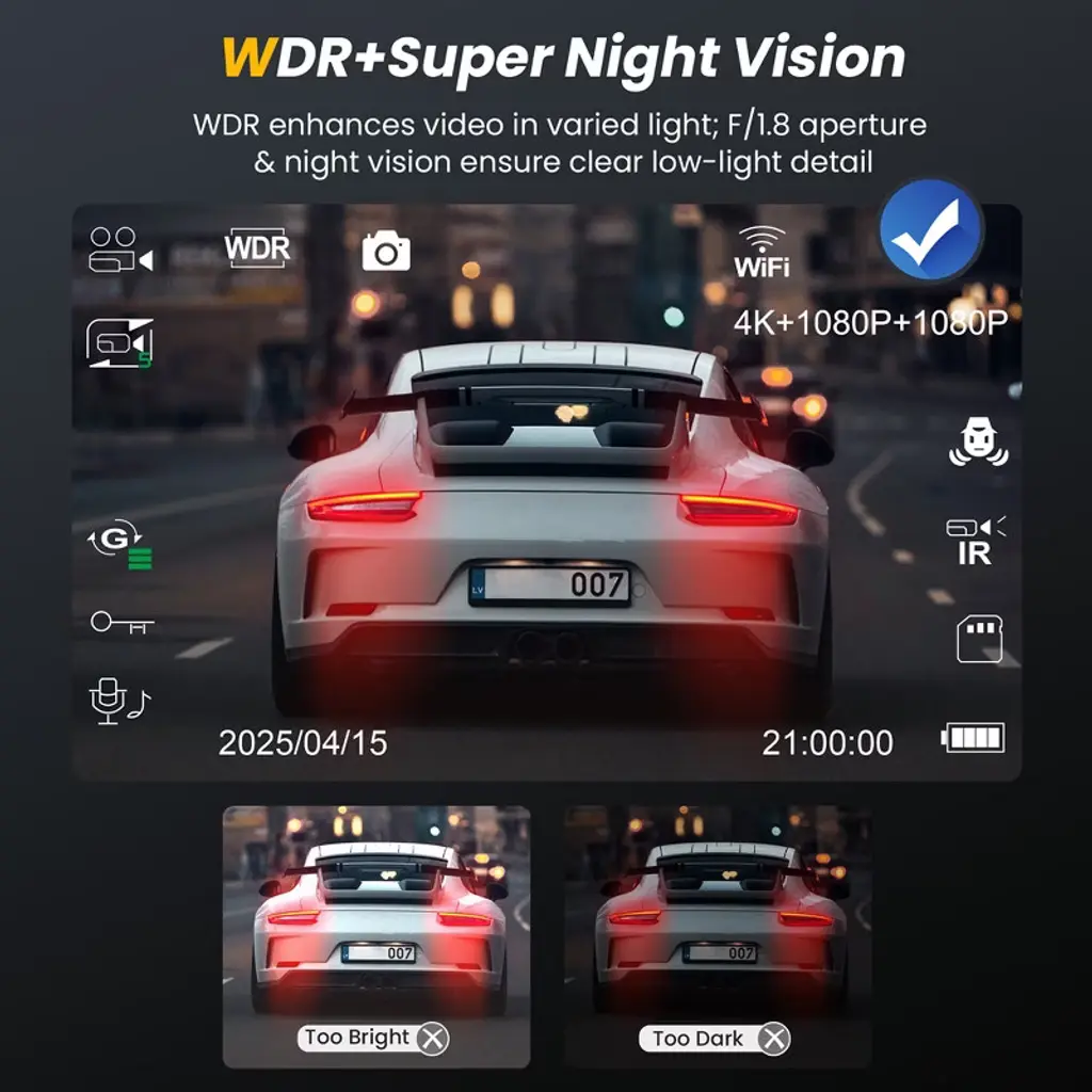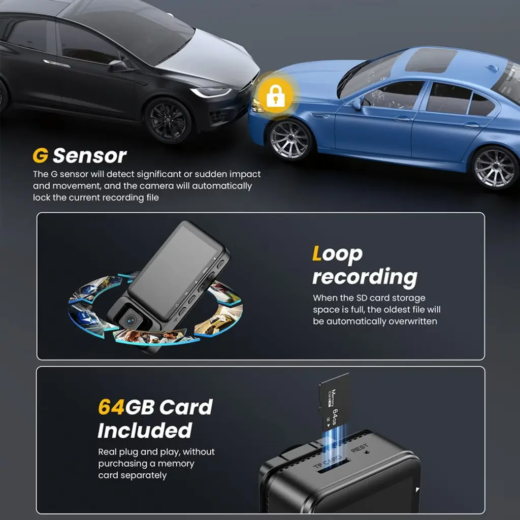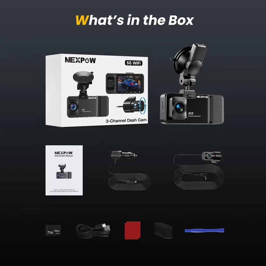 【Experience Unmatched Dash Cam Clarity】The NEXPOW K02 Dash Cam features a 4K Ultra HD front camera,1080P in-cabin camera,and 1080P rear camera that captures every detail day and night.With its 170° wide-angle lens designed to minimize blind spots,this driving recorder maximizes road safety while maintaining premium image quality.The triple-lens system operates simultaneously – recording critical angles without missing a single moment,making it the ultimate solution for highway journeys,urban commutes,parking surveillance,and incident documentation.Enjoy complete security coverage from every perspective,ensuring confidence on every drive.【HDR & IR Technology for Enhanced Night Vision】The NEXPOW K02 Dash Cam delivers exceptional night vision capabilities,offering superior performance even in low-light conditions.Its advanced High Dynamic Range (HDR) technology automatically adjusts exposure settings to produce sharper nighttime footage.Critical details like license plates and road signs remain distinctly visible in near-darkness,providing drivers with clear visibility for safer navigation.This cutting-edge system ensures peace of mind and enhanced road safety during nighttime or low-light driving conditions through intelligent imaging optimization.【GPS Dashcam Tracking】The NEXPOW K02 Dash Cam features a 3-inch IPS screen for real-time monitoring of speed/direction,while its paired app synchronizes to display precise routes and locations.Equipped with built-in GPS,this dashcam records complete driving sessions with travel paths and timestamps,ensuring evidence for insurance claims or disputes during unforeseen emergencies on the road.【24/7 Dash Cam Surveillance with Auto Loop Recording】The NEXPOW K02 Dash Cam features a G-sensor collision lock (adjustable sensitivity),auto-loop recording,and an optional parking mode.The auto-loop recording overwrites the oldest files (excluding protected clips) to ensure continuous storage.WIt automatically captures collision footage and monitors your vehicle around the clock.【Connect via 5G WiFi to Smart Dash Cam】Through the free Lucky Cam app,effortlessly pair your smartphone with the dash cam.Enjoy live streaming of real-time recordings,remotely adjust camera settings,playback stored footage,or instantly download clips to share critical moments with your insurance provider,family,or social media.This WiFi-enabled dash cam seamlessly integrates with smartphones,eliminating cable clutter while ensuring secure,around-the-clock access.Monitor your vehicle's live status anytime,anywhere with uninterrupted connectivity.【Pre-installed 64GB Storage Card】The NEXPOW K02 Dash Cam combines a user-friendly design with effortless setup,featuring a pre-installed 64GB memory card and GPS suction mount for installation in just few minutes.Equipped with multilingual voice prompts and intuitive one-touch controls,this dash cam is equally accessible to tech newcomers and seasoned drivers alike.Its automatic power management and crystal-clear screen ensure seamless operation across all driving scenarios.【NEXPOW Support】The complete package includes a K02 Dash Cam,a rear camera,a pre-installed 64GB microSD card,a car charger,a GPS suction mount,and a user manual.Should you have any questions regarding our dash cam,feel free to reach out to us — we guarantee a response within 24 hours.The product comes with a 1-year warranty and lifetime free technical support from our experts.