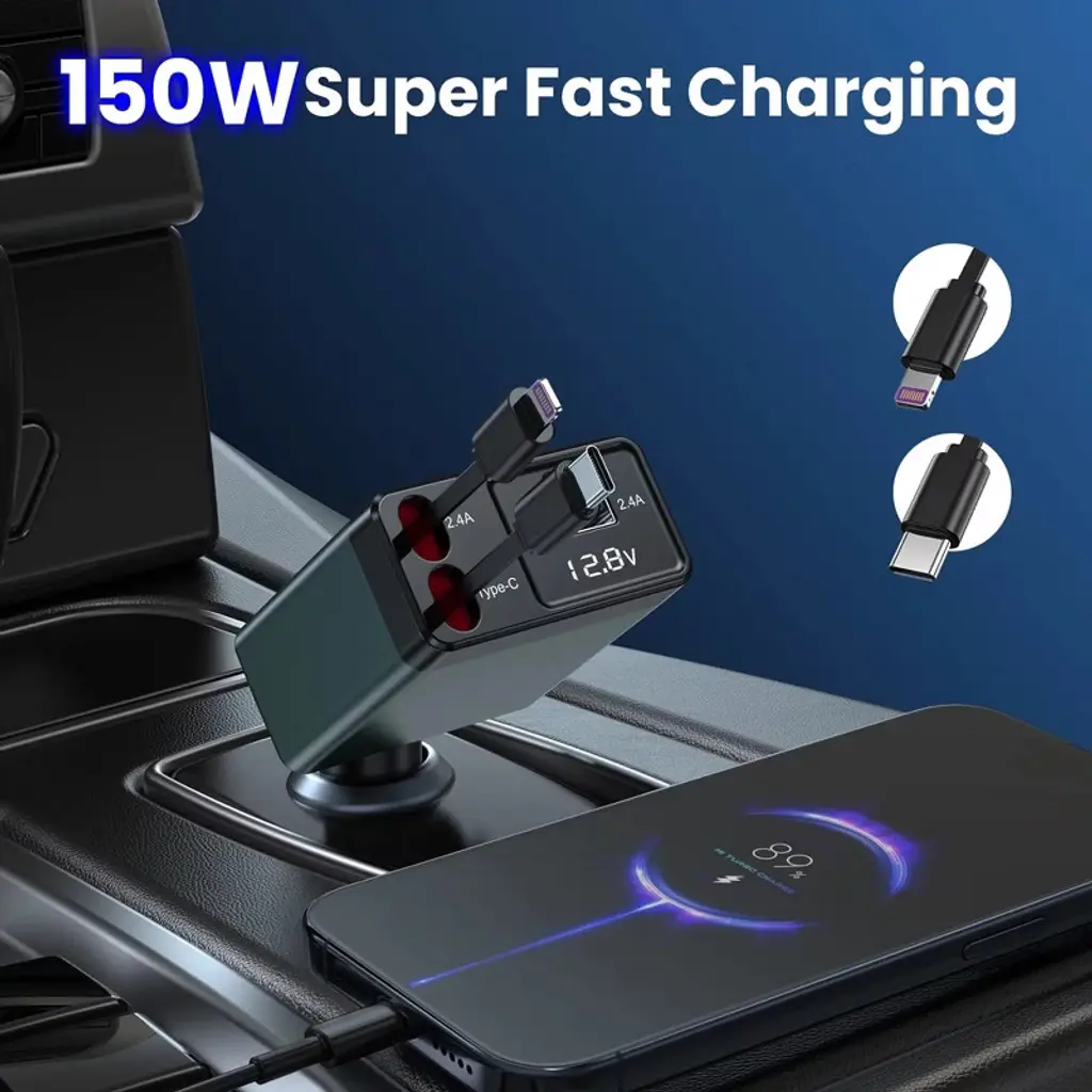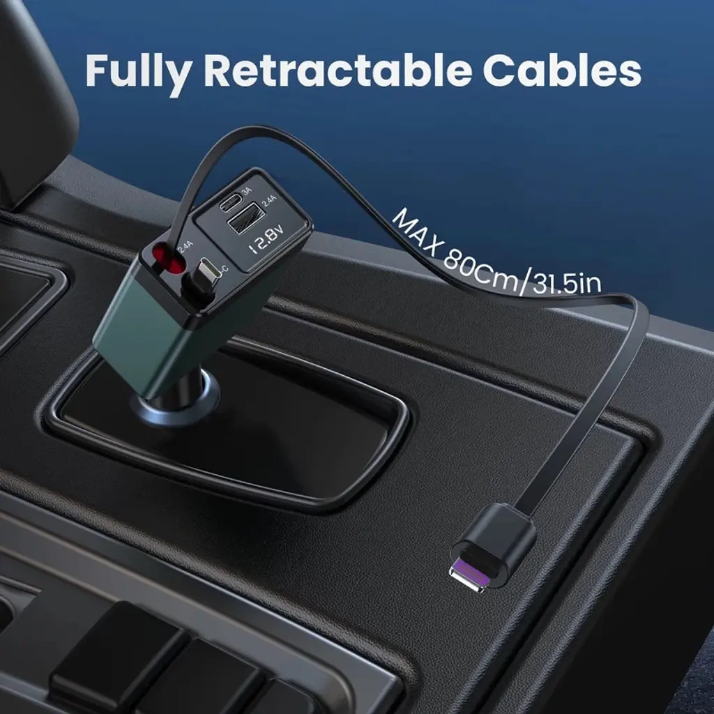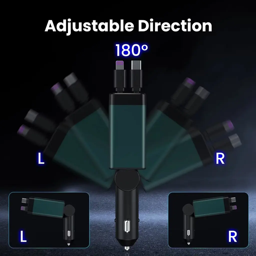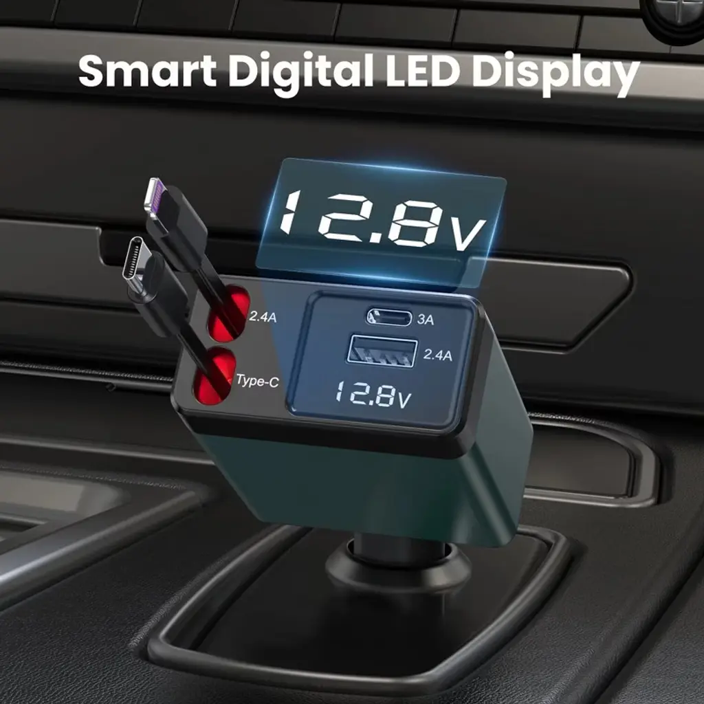 【4 IN 1 CAR CHARGER】The fast car charger comes with two built-in retractable cables: USB-C and Lightning; so you don't have to worry about misplacing or forgetting your own cable. Other features include an additional A-Type port/2.4A and C-Type port/3.2A. iPhone 15 and later users can also take advantage of the C-Type cables. 【RETRACTABLE CHARGING CABLES】The car charger adapter allows you to pull out the cable for use within 80 cm (2.6 feet); it retracts back inside the charger when not in use. Whether you are in the front or back seat, you can adjust the length of the cable as needed to avoid the inconvenience of having a cable that is too long or too short. Compared to traditional charging cables, our charger reduces the amount of space taken up in the car, eliminates cable clutter and makes the interior environment neater and cleaner, as well as improves driving safety by avoiding possible driving interruptions caused by cables.【VOLTAGE DISPLAY】Car charger is built with overcharging, over current, over-voltage, temperature control, and short circuit protection to protect your device's battery from overcharge damage.The shell is made of material made of Aluminum alloy +ABS+PC, very hard and durable! This car phone charger also features voltage display, which can monitor the current voltage in real time, allowing you to charge more safely.【180° ADJUSTABLE】This design helps prevent the charger from blocking other devices or interfering with the driver's operation, while preventing the charger cable from being overly pulled or bent, thus extending the life of the charger and connected devices. Whether the socket is in a harder to reach place or the charger is troublesome to plug in and out, it is strong enough to adapt to a variety of socket positions, adjusting the angle to suit different usage scenarios, making it easy to use for both driver and passenger.【WIDELY APPLICABLE】Suitable for iPhone,iPad,SAMSUNG,headphones, apple watch, this computer, game consoles and other mobile devices. Suitable for 12V-24V mainstream cars. All vehicles with cigarette lighter interfaces are applicable.