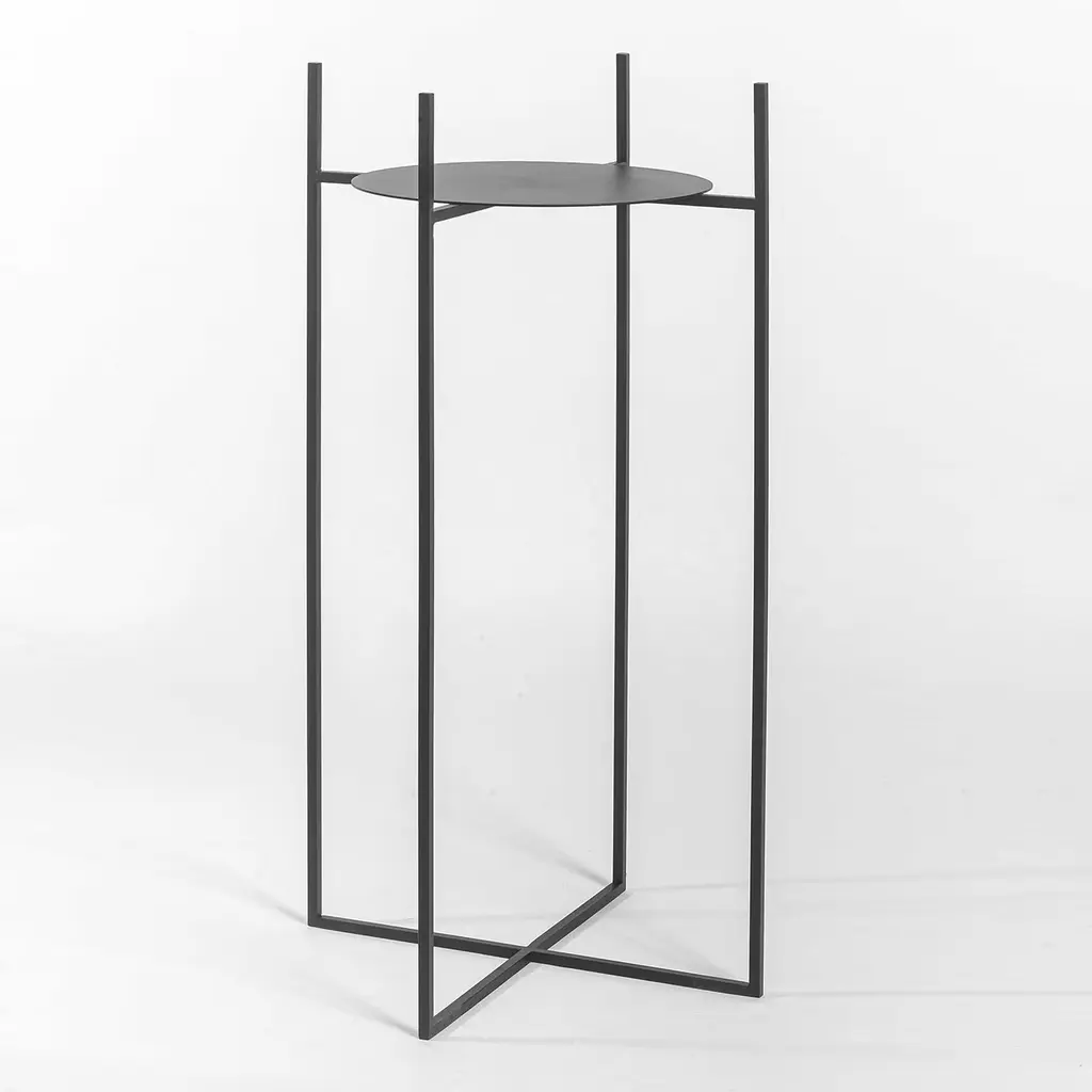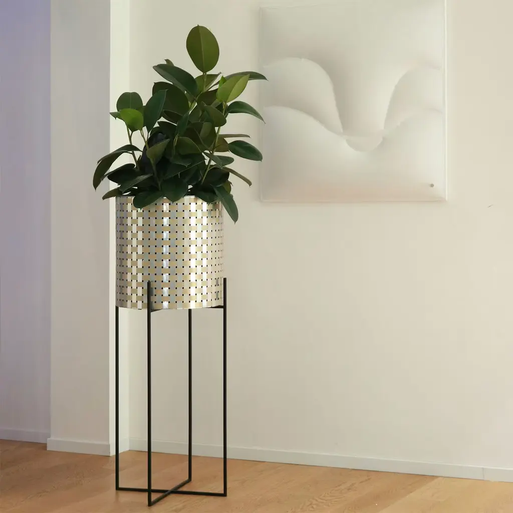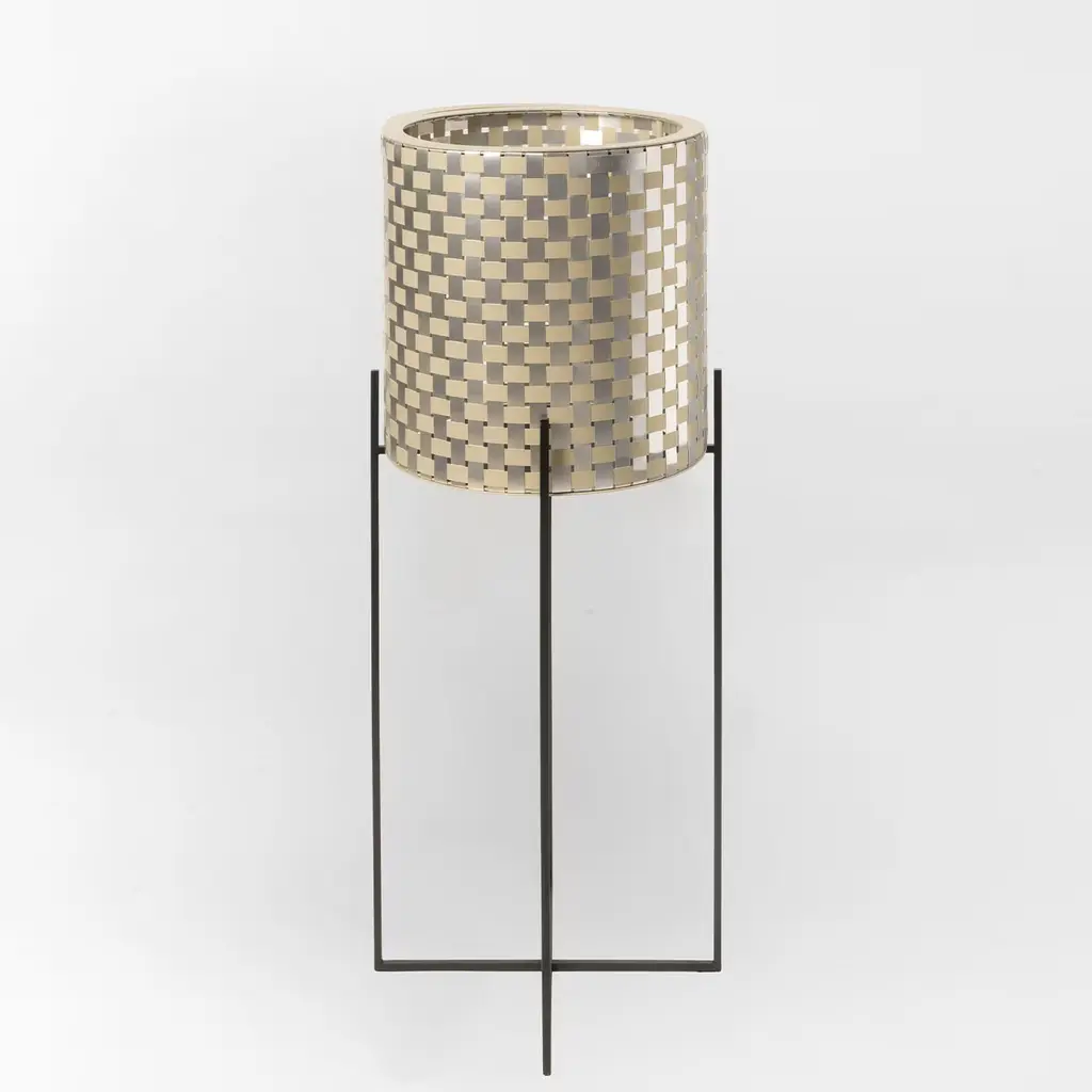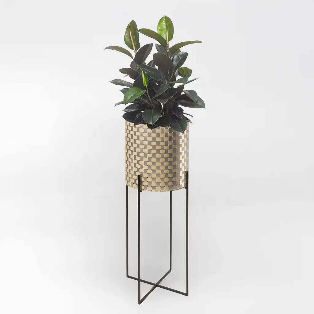 Striking in any room, this fascinating cylindrical plant holder has an exclusive, hand-made Splot covering distinguished by interwoven pattern of gold champagne and natural finished aluminum sheets. The black-painted iron structure (H 80cm) with an X-shaped base, gives it a sense of stability, while its minimalist design adds a sophisticated look. It is available in three sizes, please ask the Concierge for details.
