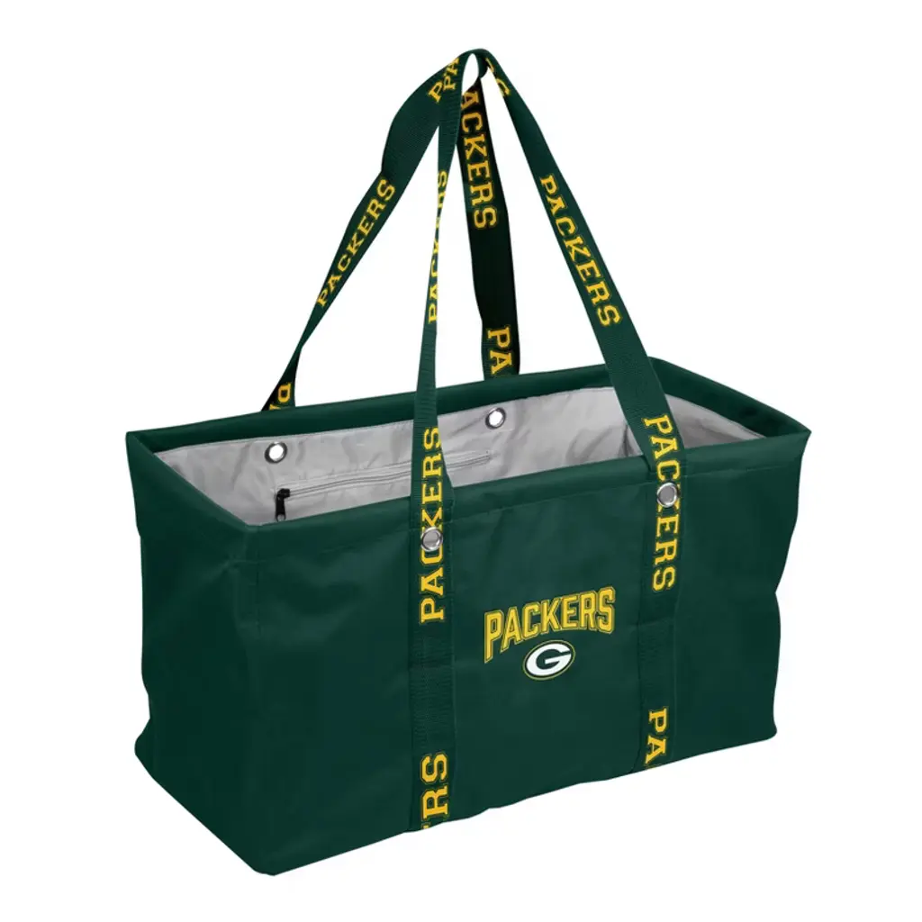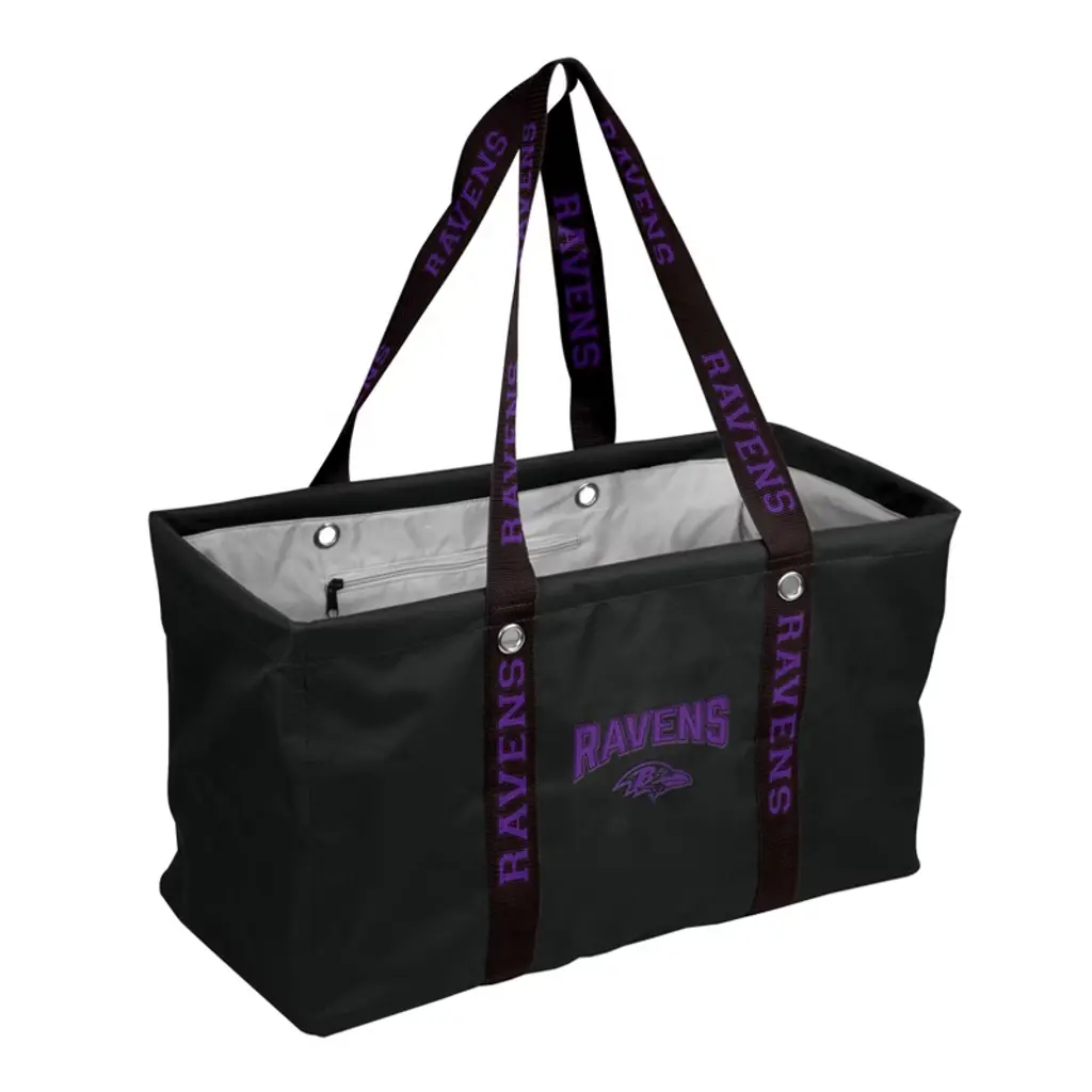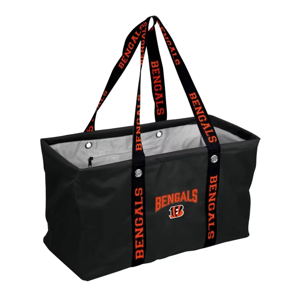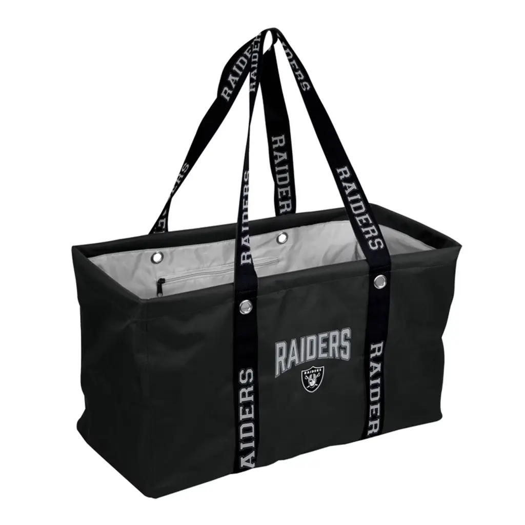 The Picnic Caddy is an innovative and stylish solution for transporting your essentials to any gathering while showing off your team spirit. This multipurpose, oversized tote features your favorite team's colors and logo. Its construction includes a sturdy bottom and wire top frame. The open top makes it easy to pack and find items. The caddy has reinforced handles with grommets that allow you to carry heavy loads, including sporting equipment or groceries, and it folds flat for easy storage. An interior zipper pocket helps you keep track of small items like bottle openers and car keys. This will be your go-to tote when packing for a tailgate, camping, the beach, the pool or any outdoor activity.