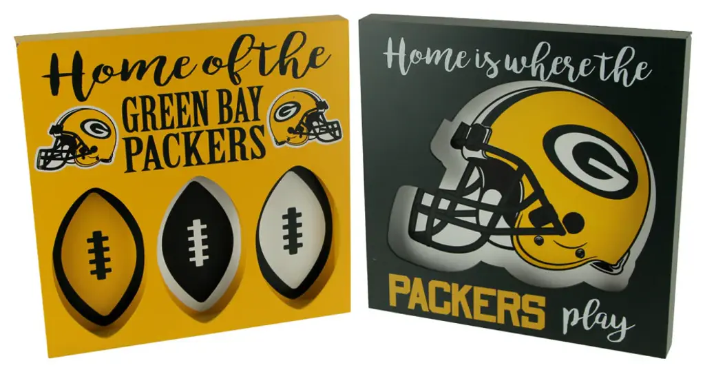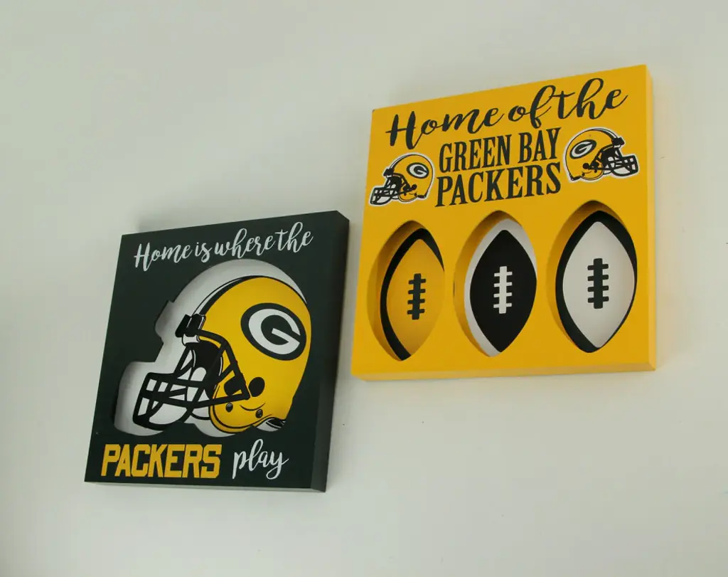 Officially Licensed11.75 inch Long, 11.75 inch High, 1.25 inch WideMade of Wood with a Pre-Installed Sawtooth Mounting Hanger On the BackFinished in Packers Colors Featuring a Cutout Helmet and Football Shapes that Give them a Cool Dimensional LookThe Perfect Addition For Your Fan Cave, Living Room Mantel, Wall Shelf, Game Room or Anywhere You Want to Show Your Team PrideShow off your team loyalty and Packers pride with this officially licensed set of wood wall plaques. Each piece features team colors and the Packers name and logo with a cutout helmet shape on one and football patterns on the other, giving them a cool dimensional look. You can display them on a shelf, or you can hang them on the wall. They are the perfect addition to your fan cave or game room. living room mantel or wherever you want to proclaim your team''s superiority. This set of 11.75 inches long, 11.75 inches high, and 1.25 inches wide Green Bay wall hangings make a great gift for any dedicated Packers fan.
