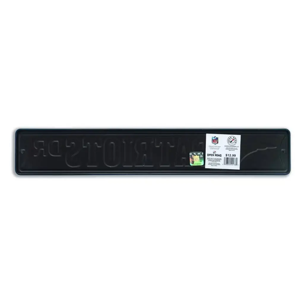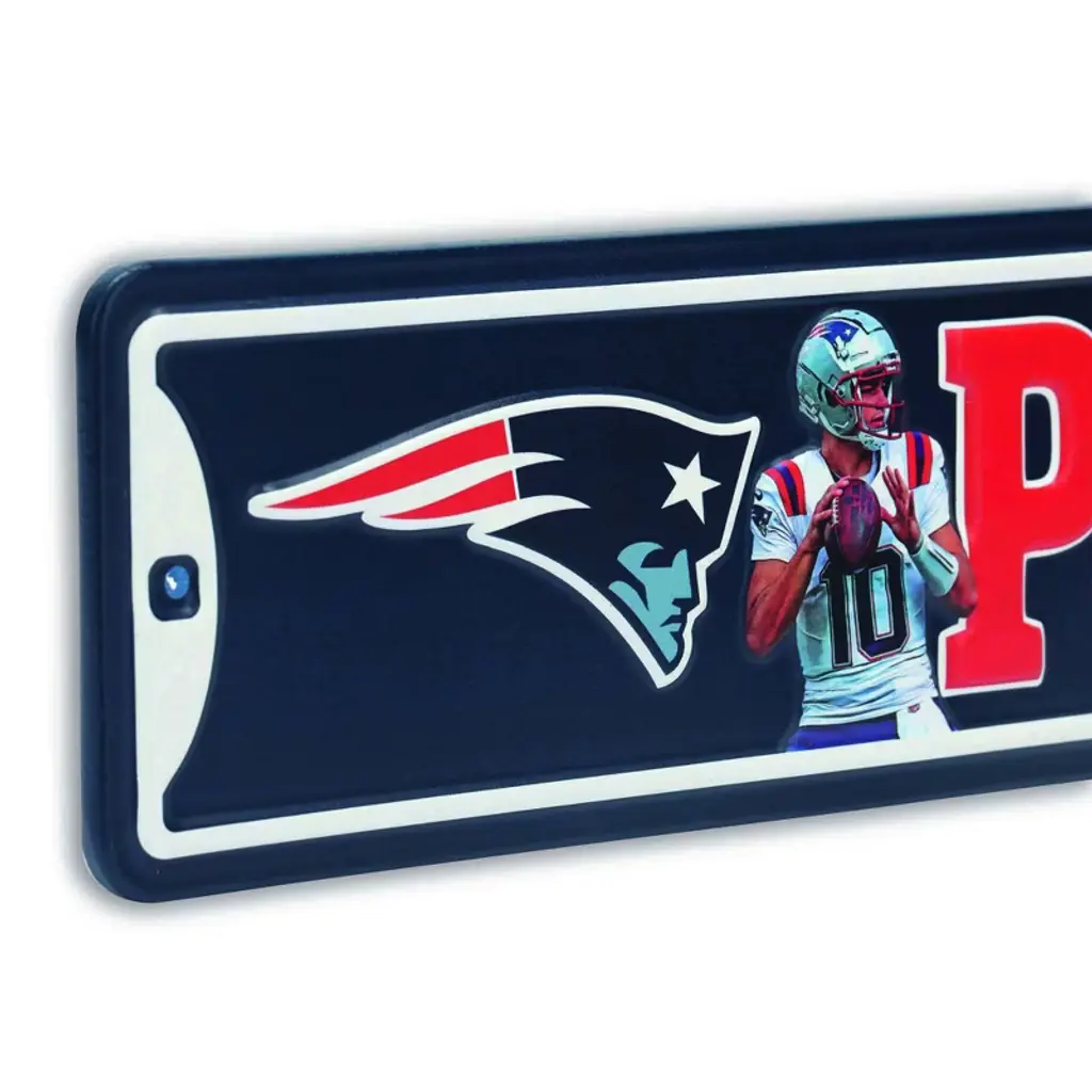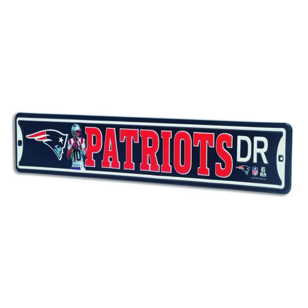 Show your unwavering New England pride with this bold Patriots metal sign that embodies the spirit of Foxborough football. Featuring the team’s iconic navy, red, and silver color scheme, the Flying Elvis logo, and a powerful player graphic, this piece delivers a winning look. With “Patriots Dr.” in bold lettering, it adds a street-style edge perfect for any fan cave, office, or game room. A true essential for die-hard Patriots fans.