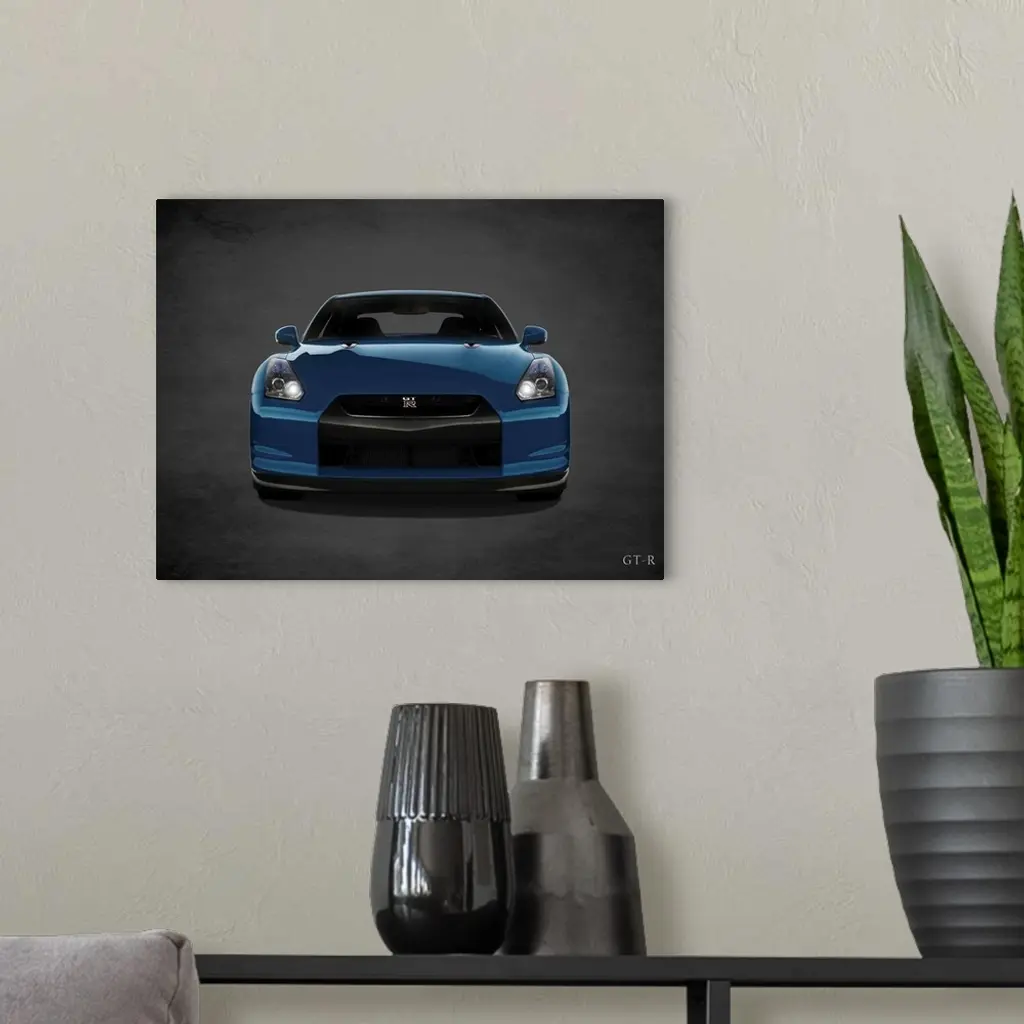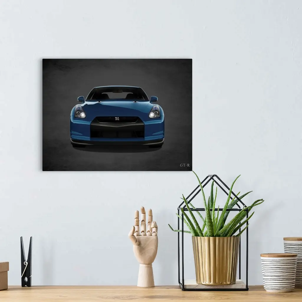 Photograph of a blue Niassn GT-R printed on a black background with a dark vignette.