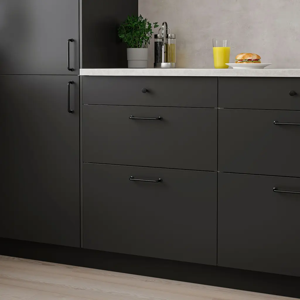 NICKEBO Drawer front - matte anthracite 36x5 ". The clean and simple design makes it easy to place and personalize with knobs, handles, worktop and other details to strengthen your style. Made of recycled wood dressed in a foil made mainly of recycled plastic. Fits SEKTION kitchen series.