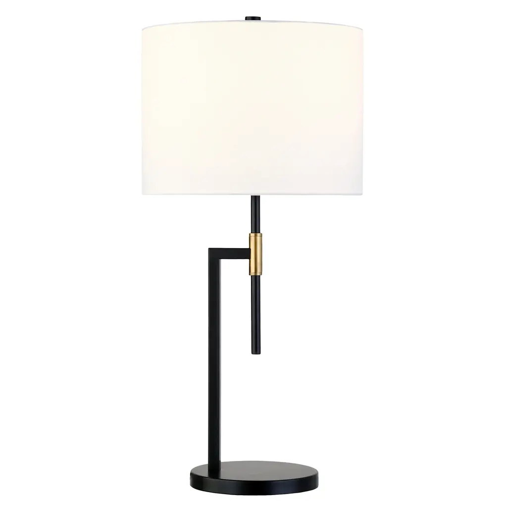 This table lamp's unique shape and mid-century-modern design adds an eye catching element to your living room, office space, bedroom, and more. Its brass accent against the matte black base sets it apart from your standard table lamp and brings a touch of elegance to its crisp design. The white fabric drum shade adds refinement to your space with clean lines that create an inviting glow in any room. Features: