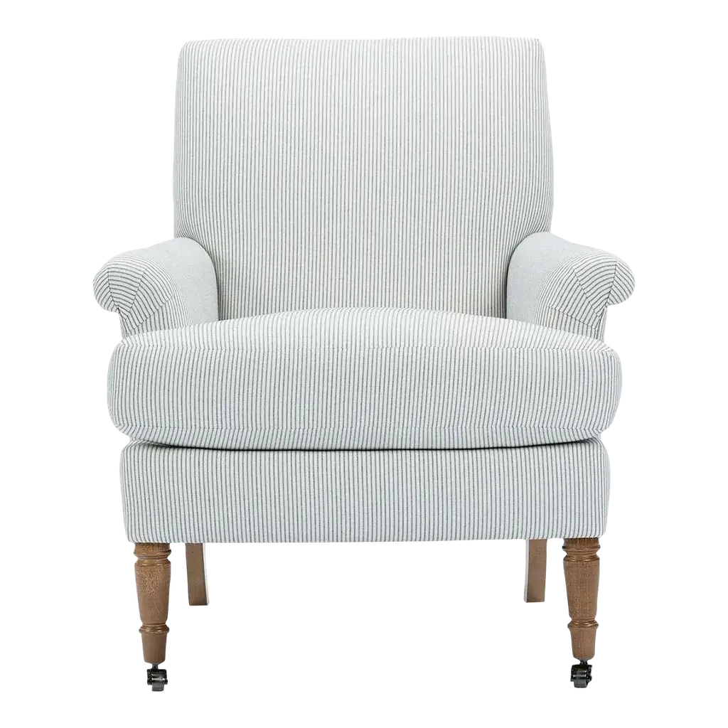 Resting on turned pine legs, this settee boasts versatile proportions, English arms, and neatly tailored upholstery. A generous foam-and-fiber fill ensures long-lasting comfort and support. Handcrafted in the USA.