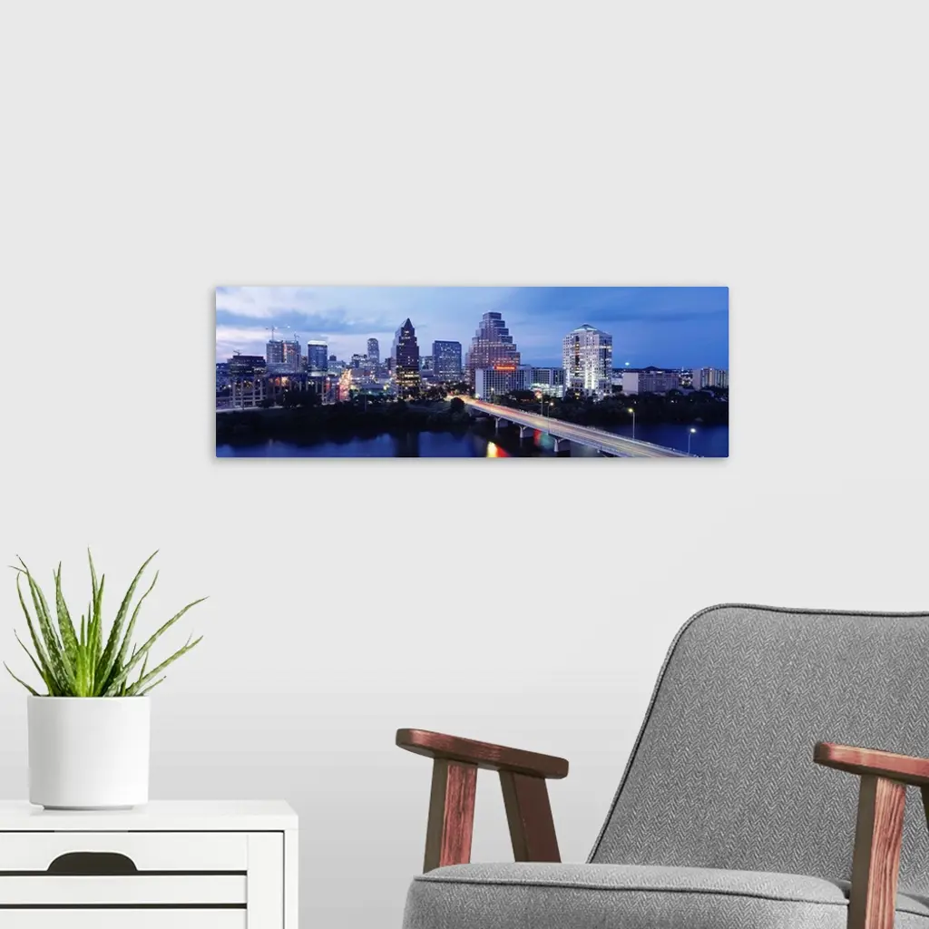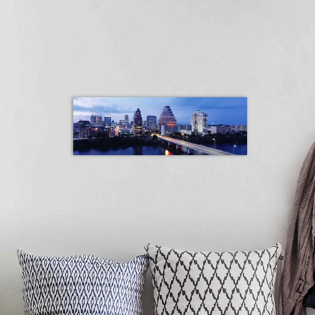 Panoramic photograph taken within the capital city of Texas shows the skyline at nighttime sitting in front of the Colorado River in the foreground. Photographer uses a slow shutter speed to get the fast moving effect of lights on the cars.