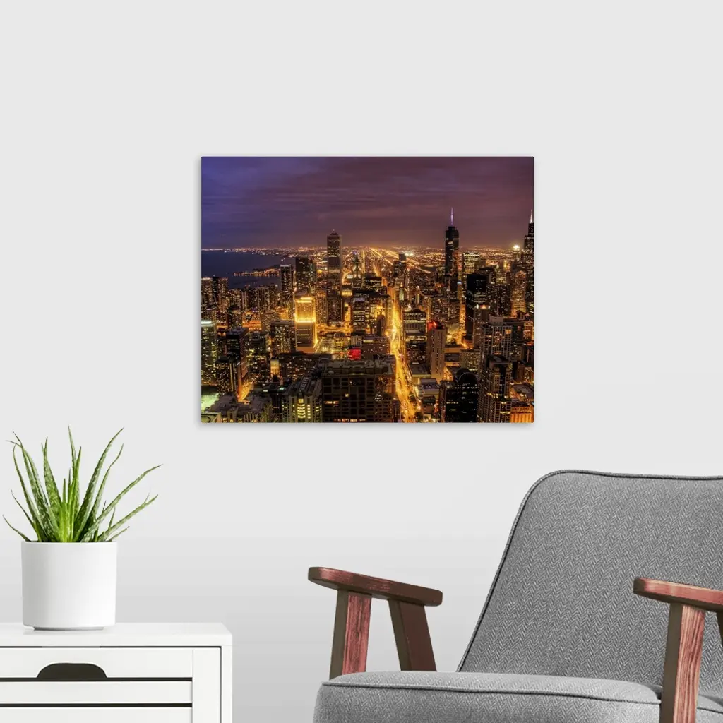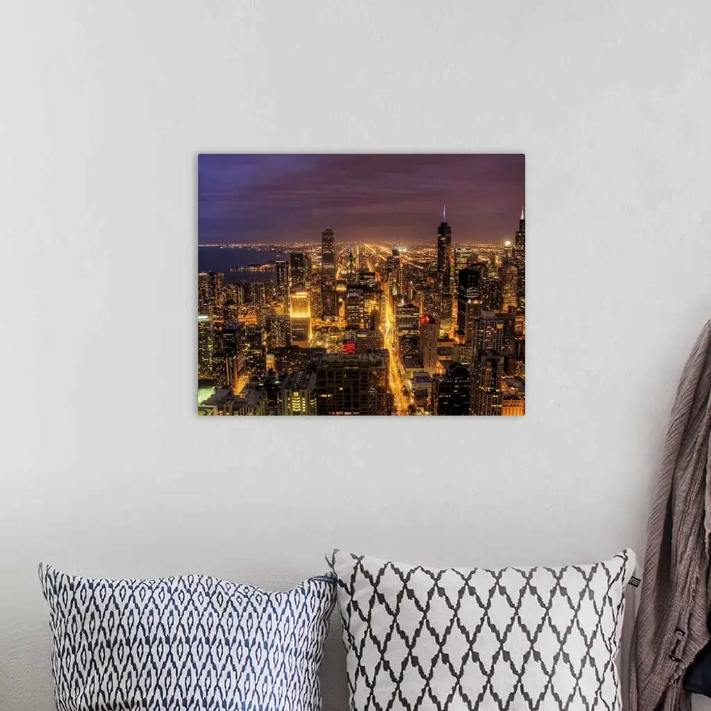 High-angle photograph of city with buildings and streets lit up at dusk.