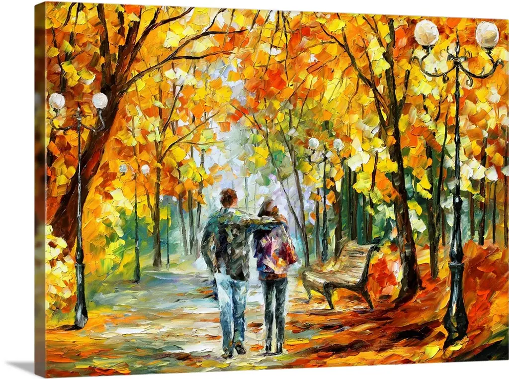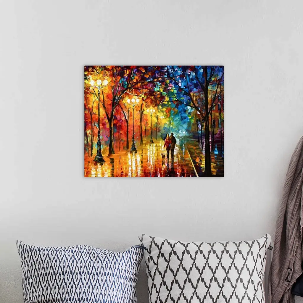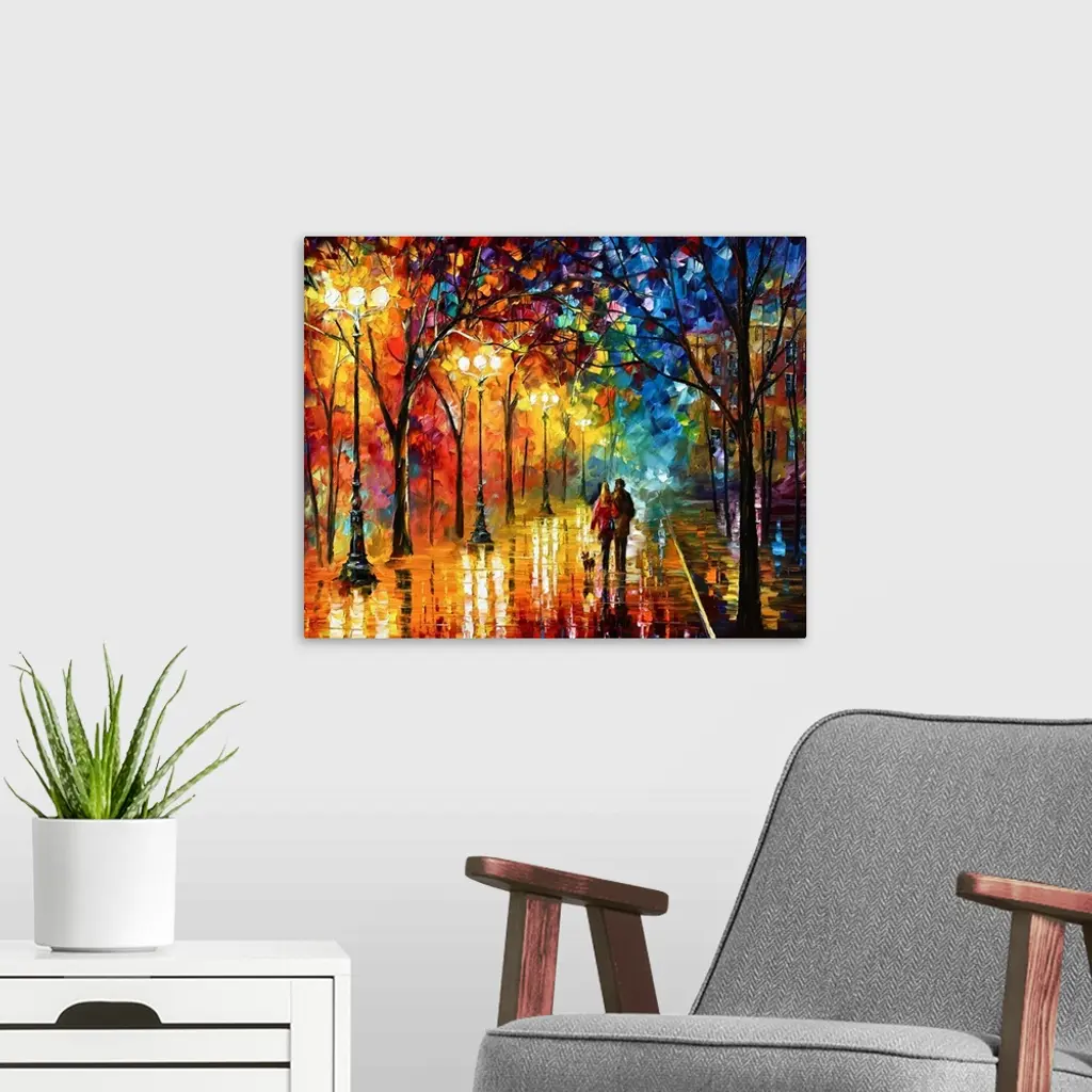 Contemporary landscape art work of a couple strolling down a city street at night with street lights illuminating wet pavement and trees like stained glass windows.