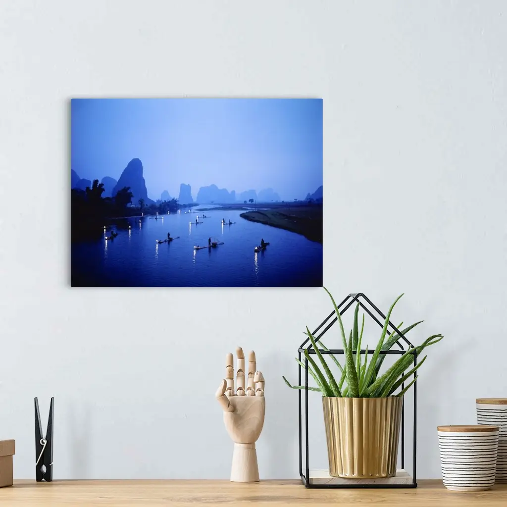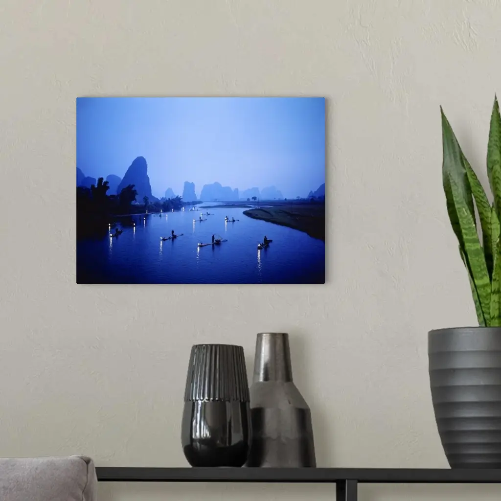 This large piece shows several boats out in the water each with a lamp on them for night fishing.