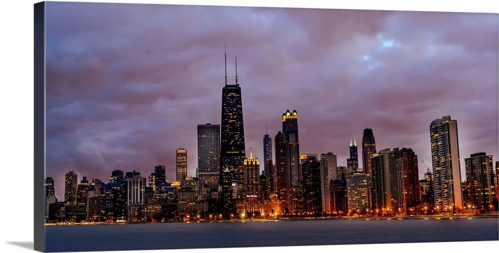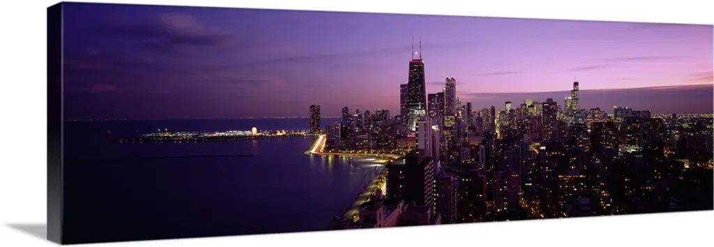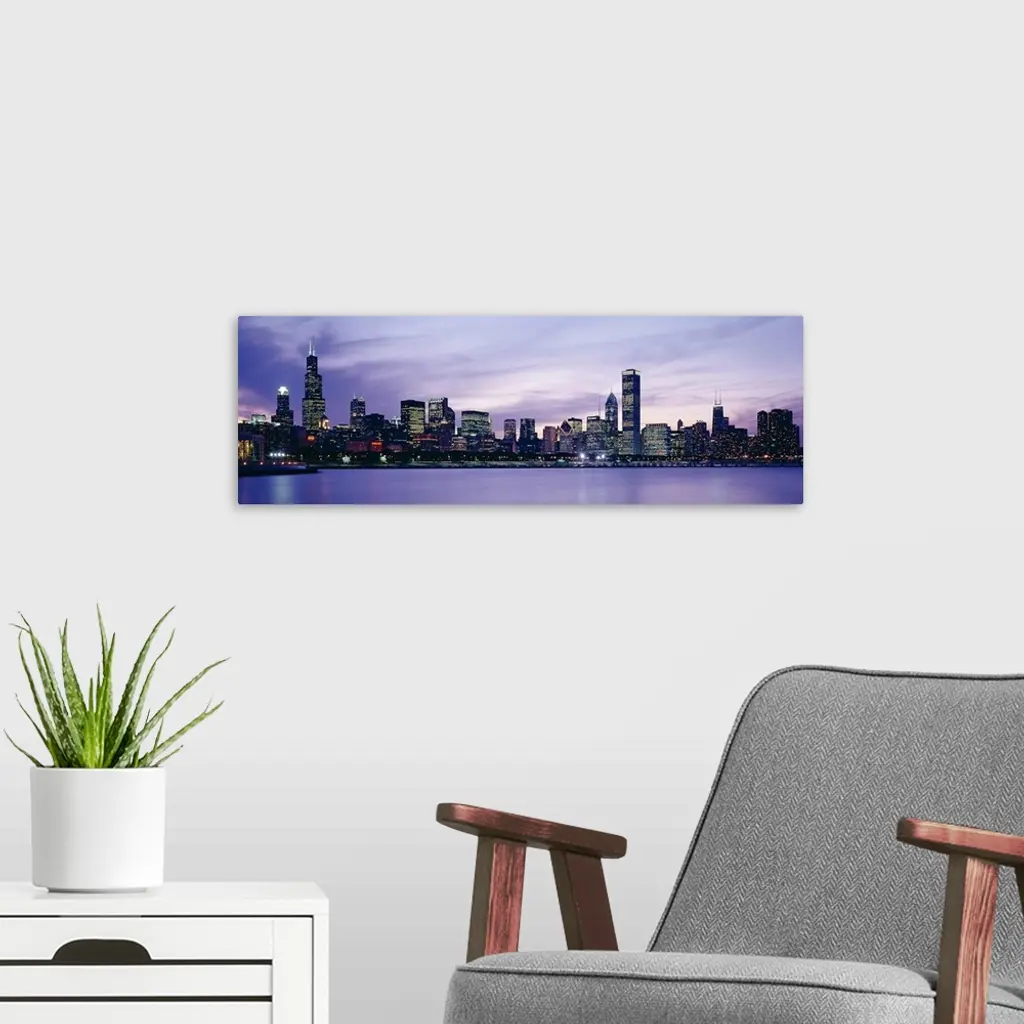 Big canvas photo of an illuminated cityscape along a smooth waterfront at dusk.