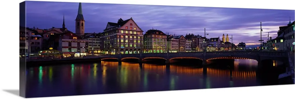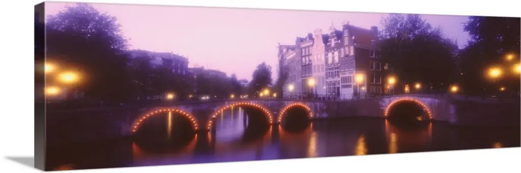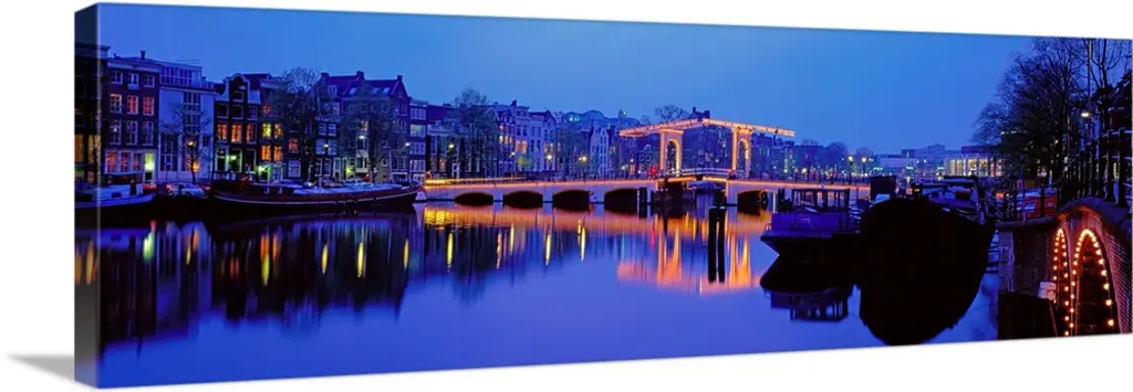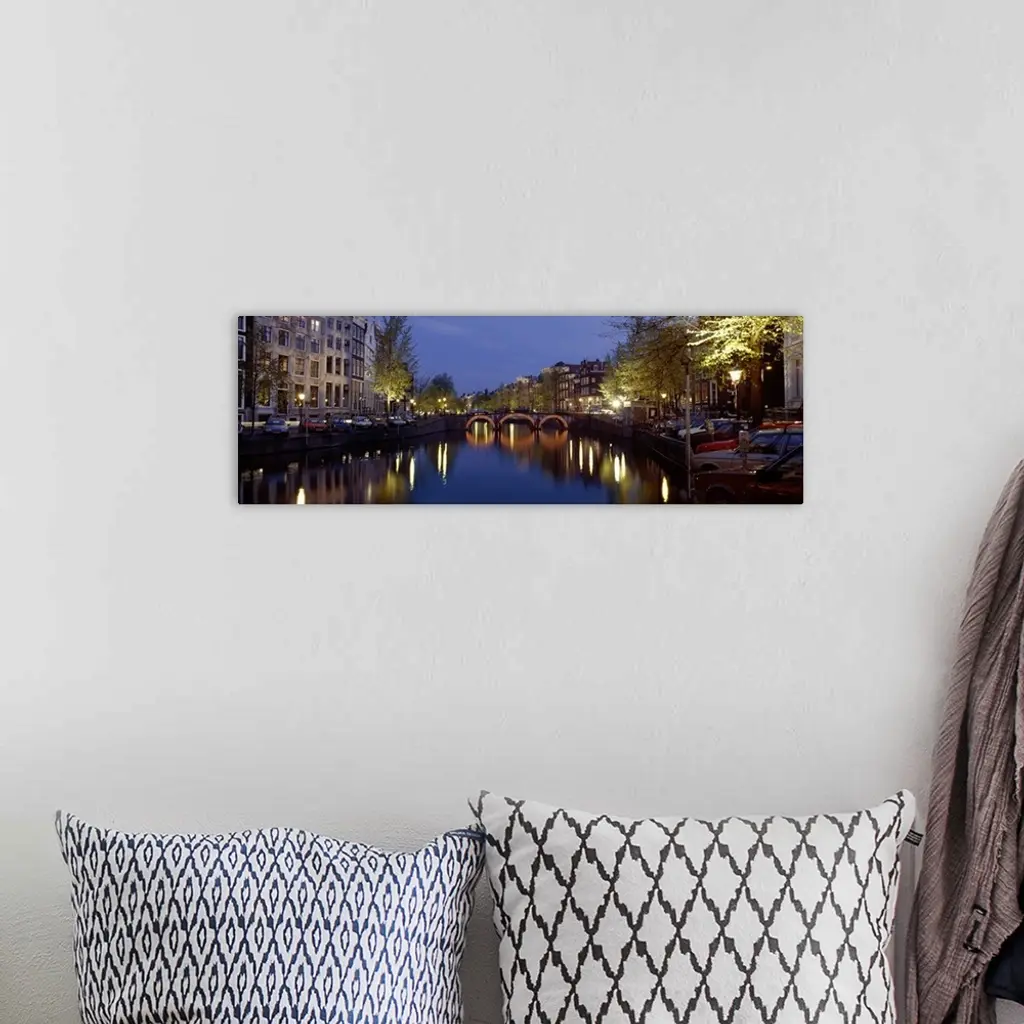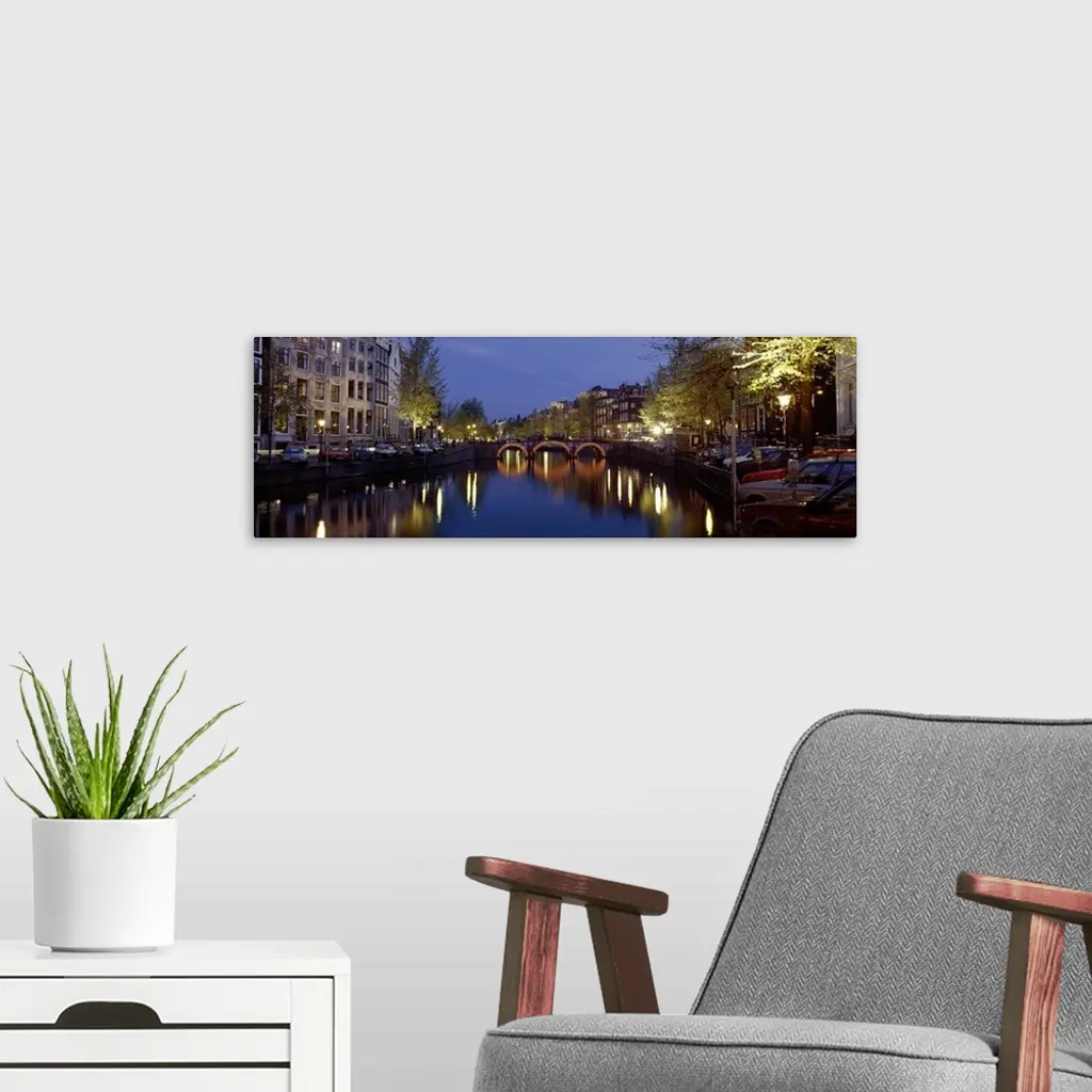 A wide angle view of a canal in Amsterdam with buildings and street lights illuminated on either side and reflecting in the water.