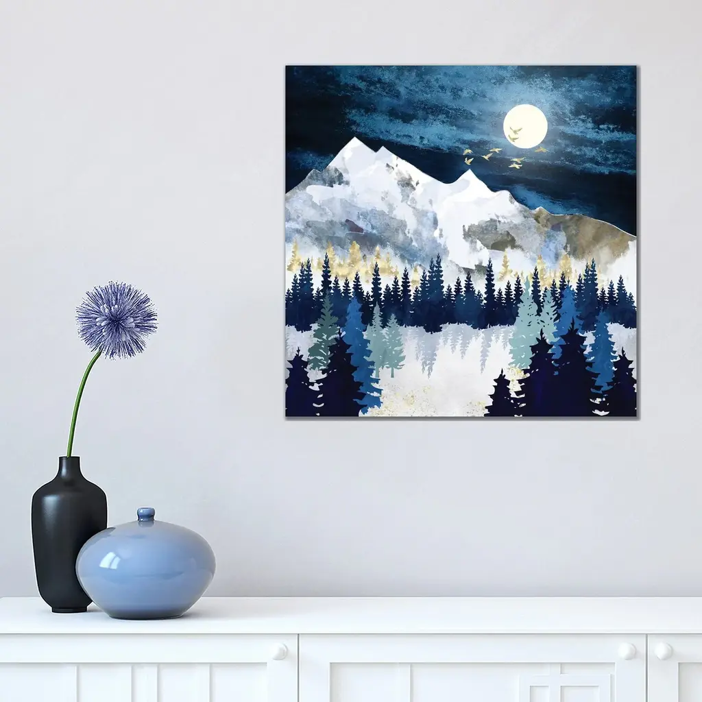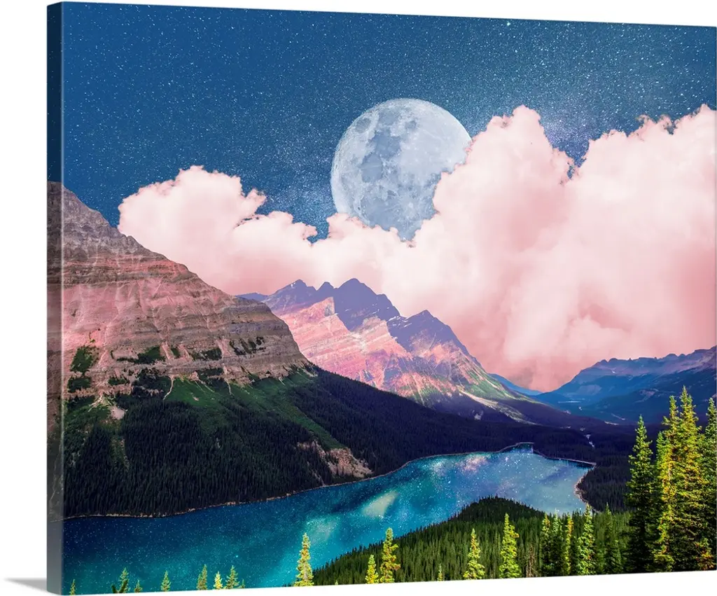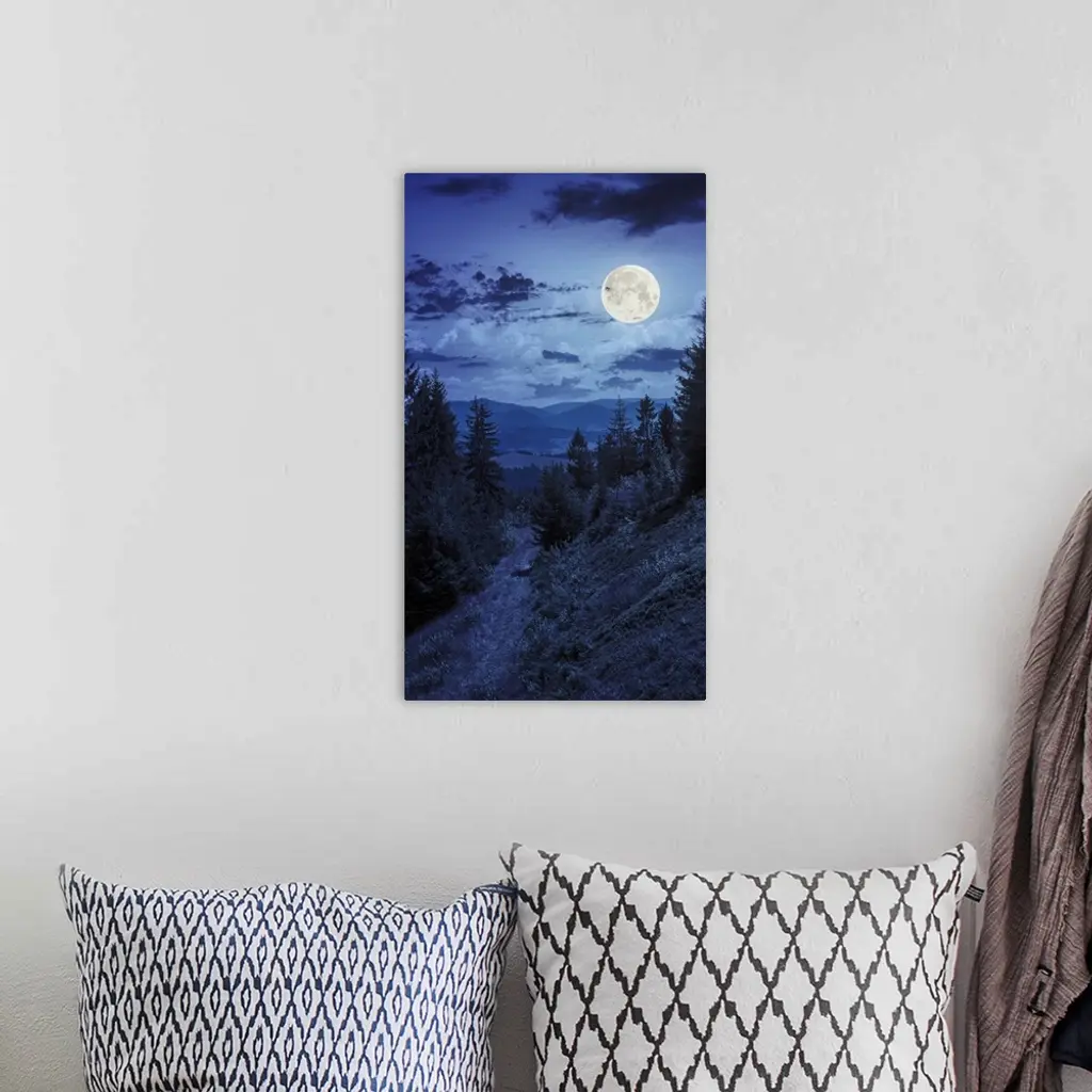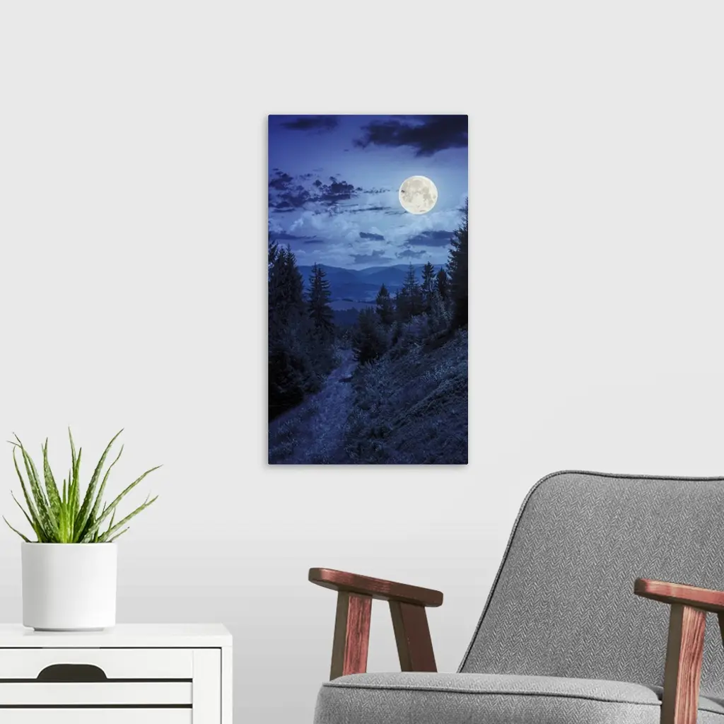 Wide trail in the shade of pine trees of green forest in mountains at night in full moon light.