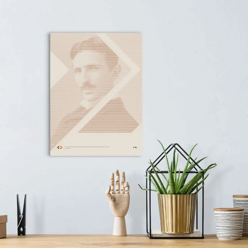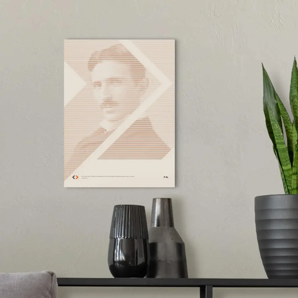 Graphic poster of Nikola Tesla made up entirely of orange, black, and gray arrows. Inspired by the great minds of science and those that are able to see the smaller details of our world.?Our virtues and our failings are inseparable, like force and matter. When they separate, man is no more. ? ?Nikola Tesla�