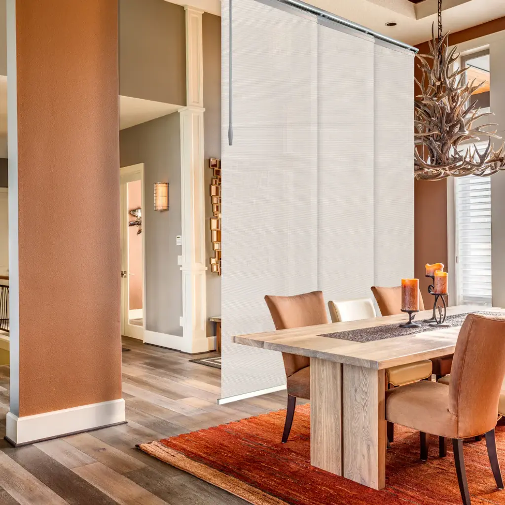 Central Design Products is pleased to introduce a new innovative panel track that offers easy 2-way installation, adding an alluring style and refined touch to your home decor. The single rail design of the track is sleek, compact, and reduces the overall footprint and weight of the installation, eliminating bulky, intrusive window treatments. Adjusting the panel height is a breeze � simply trim the panel, re-attach the liner, and install the panel weight. Detailed instructions are included.The panel track also features a patented slider design, made with aluminum and fitted with bearings that allow for durable and smooth operation. The sliders are stacked closer together than conventional panel tracks, reducing light bleed coming from the gaps between panels. This track has endless uses from dividing rooms, garages, offices, and closets to decorating windows and patios. Available in larger sizes including 8, 10, and 12 panels. Extends from 36-66� wide. Each panel measures 23.5" wide and 116" tall, with a total installation height of 118.5" (includes the 2.5" rail track). The track can be wall or ceiling mounted. The panels can stack on the left or the right. The clearance from the wall is extendable from 1.25� to 3.25� and projection from the wall is extendable from 3� to 4.25�. Nikolina panel is made from 85% Vinyl 15% Polyester, with a light filtering shade that blocks 60% of the light.