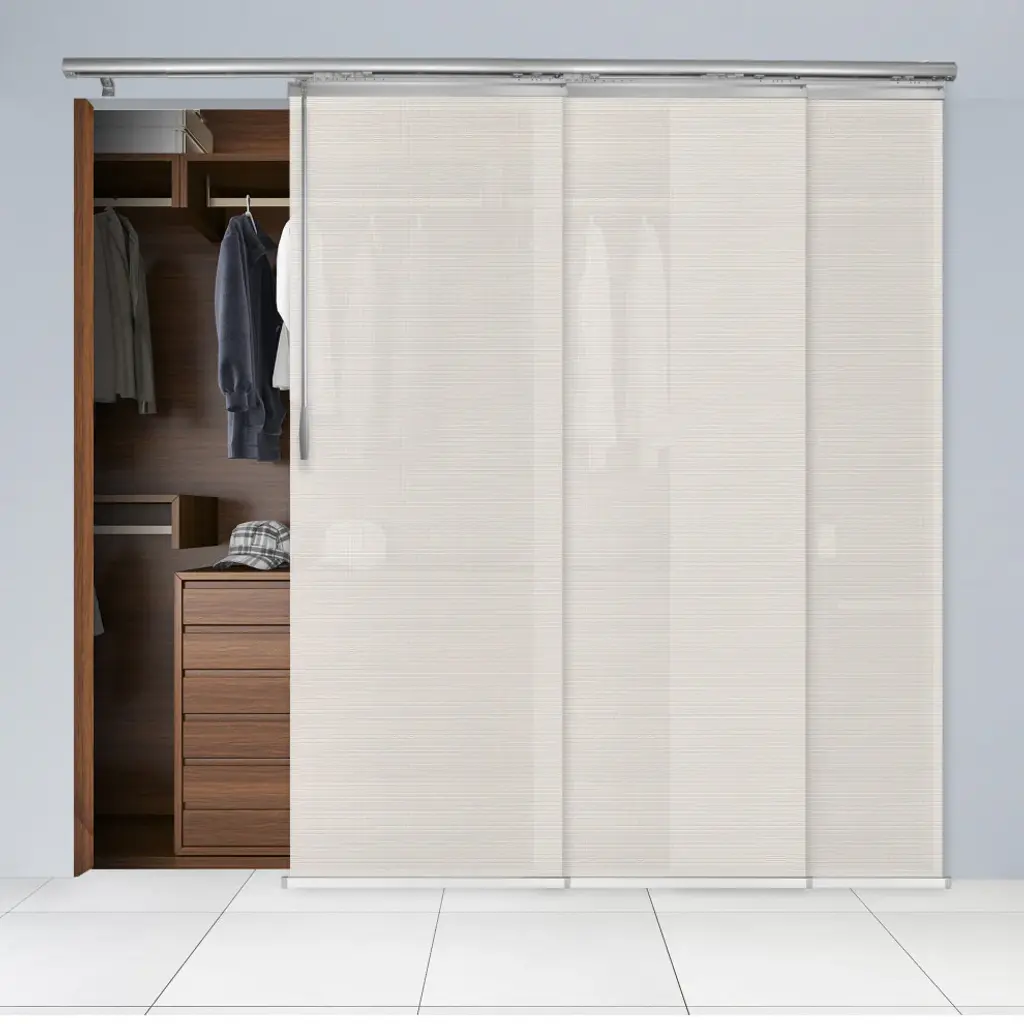 Central Design Products is pleased to introduce a new innovative panel track that offers easy 2-way installation, adding an alluring style and refined touch to your home decor. The single rail design of the track is sleek, compact, and reduces the overall footprint and weight of the installation, eliminating bulky, intrusive window treatments. Adjusting the panel height is a breeze � simply trim the panel, re-attach the liner, and install the panel weight. Detailed instructions are included.The panel track also features a patented slider design, made with aluminum and fitted with bearings that allow for durable and smooth operation. The sliders are stacked closer together than conventional panel tracks, reducing light bleed coming from the gaps between panels. This track has endless uses from dividing rooms, garages, offices, and closets to decorating windows and patios. Available in larger sizes including 8, 10, and 12 panels. Extends from 36-66� wide. Each panel measures 23.5" wide and 91.5" tall, with a total installation height of 94" (includes the 2.5" rail track). The track can be wall or ceiling mounted. The panels can stack on the left or the right. The clearance from the wall is extendable from 1.25� to 3.25� and projection from the wall is extendable from 3� to 4.25�. Nikolina panel is made from 85% Vinyl 15% Polyester, with a light filtering shade that blocks 60% of the light.