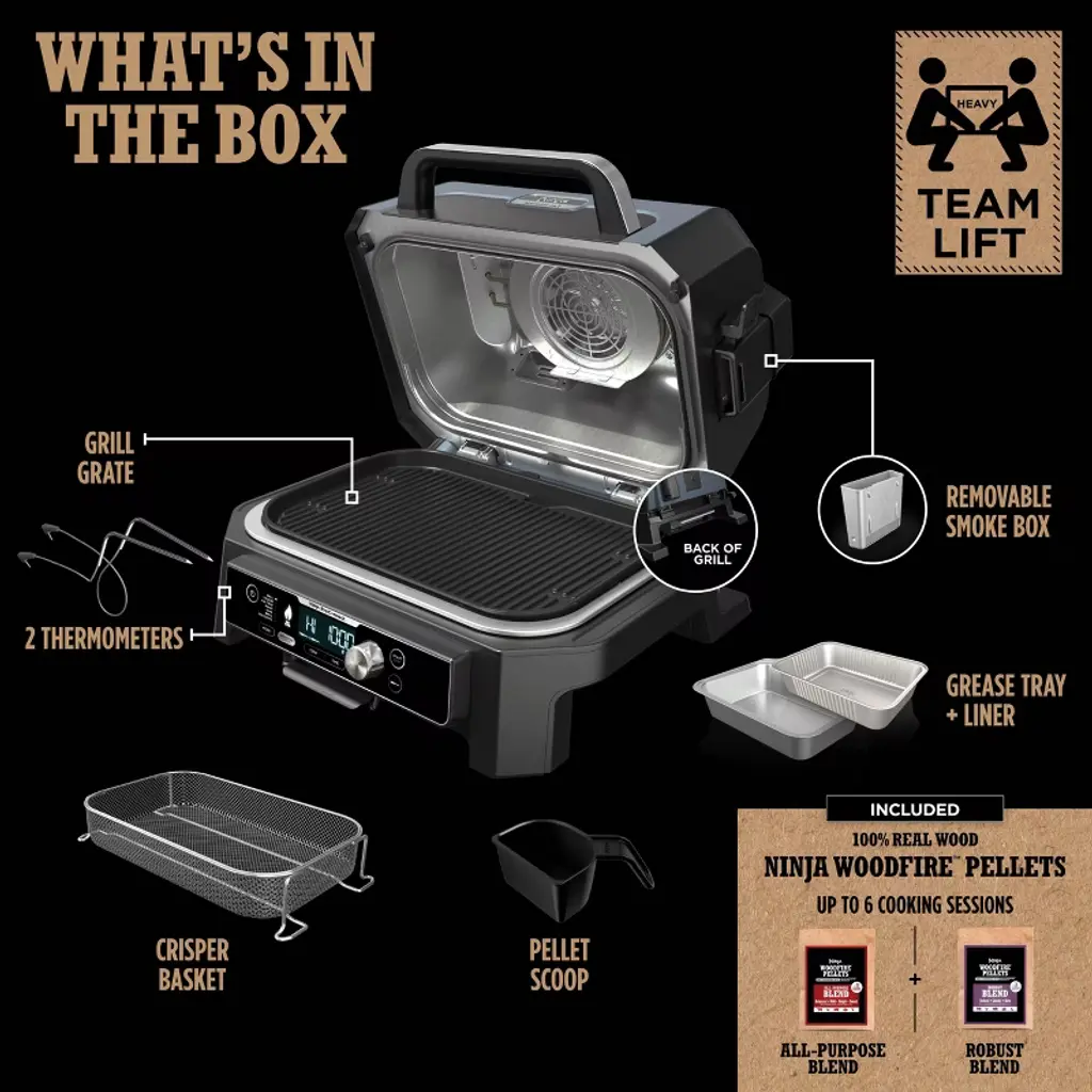 Enjoy your cookout with the fully connected Ninja Woodfire Pro Connect™ Premium XL Outdoor Grill & Smoker. With Ninja ProConnect™, monitor and control the cooking of 2 different proteins, get real-time notifications to your phone, and even access recipes and cooking charts, all from the palm of your hand. Master Grill, BBQ Smoke, and Air Fry with 100% authentic smoky flavor you can taste.